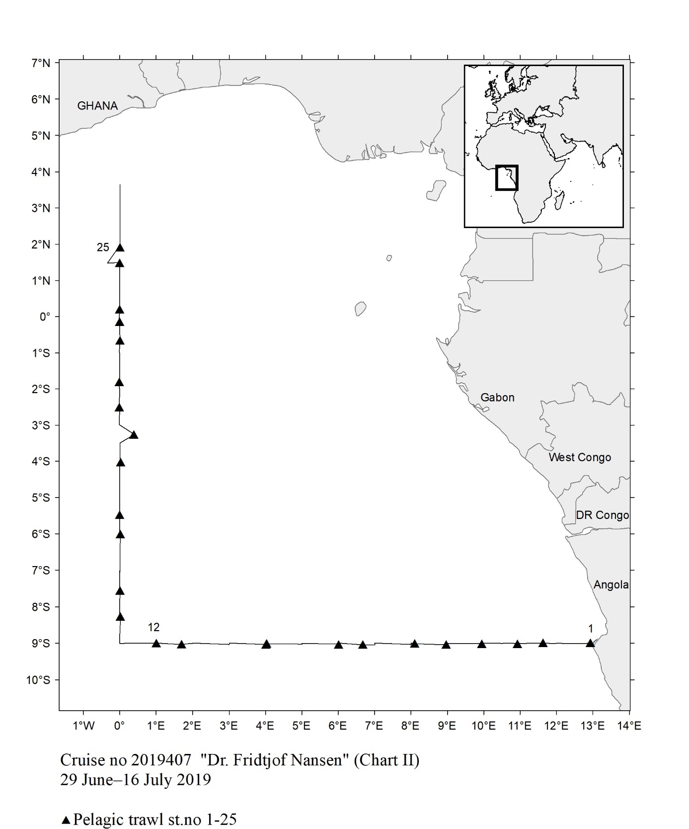 | 2019838 | 4.7.-6.8. | «Vendla» | Pimary objective: Large-scale mapping and abundance estimation of Northeast Atlantic (NEA) mackerel, Norwegian Spring-Spawning (NSS) herring and blue whiting. Swept area trawling for mackerel and acoustic recordings and trawling on registrations for NSS herring and blue whiting.Secondary objectives: Sampling of zooplankton (0-200 m depth) and water temperature/salinity profiles (0-500 m depth). Opportunistic marine mammal observations along the covered transects.Mapping of Atlantic salmon, lumpfish and other pelagic fish species. | Atlantic Ocean, Norwegian Sea | 12-82 | 36-126 | 137-138 |