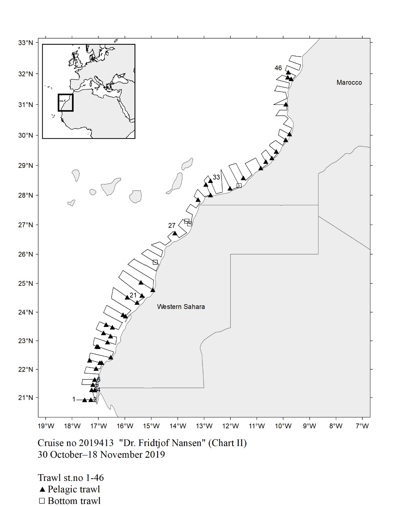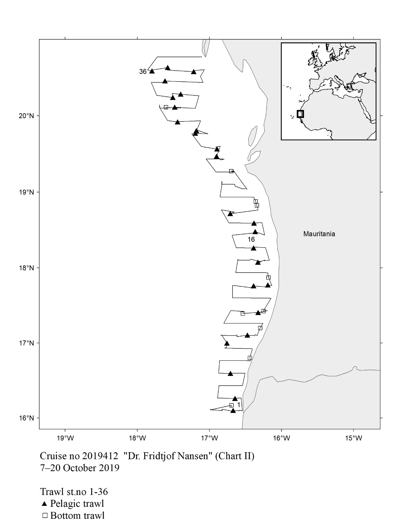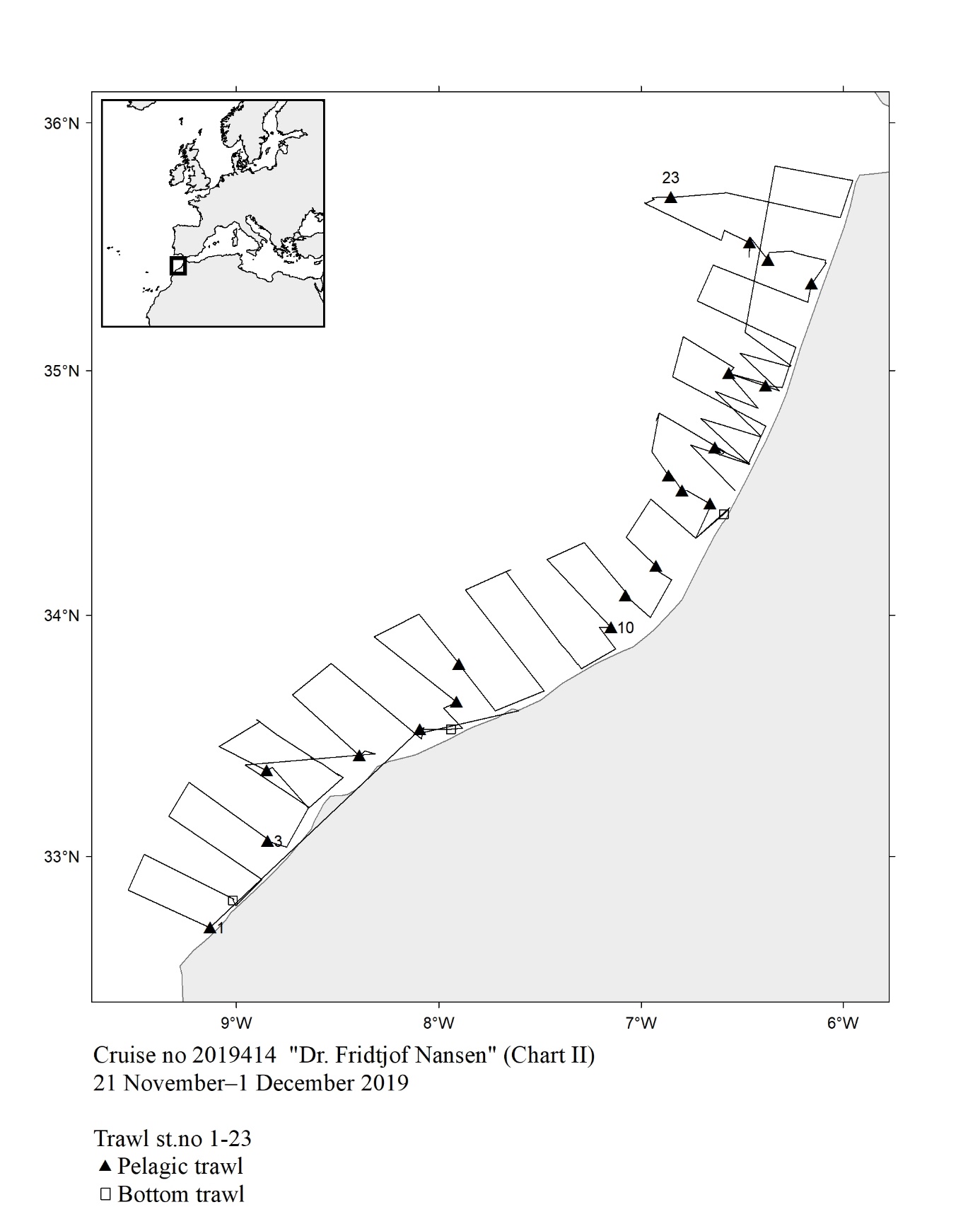 | 2019809 | 4.3.-17.3. | “ Vendla” | Acoustic trawl survey on Capelin spawning stock. Methodological survey using a stratified survey design aiming to measure the abundance of Capelin during the spawning season. | Norwegian Sea | - | 1-22 | 127 |