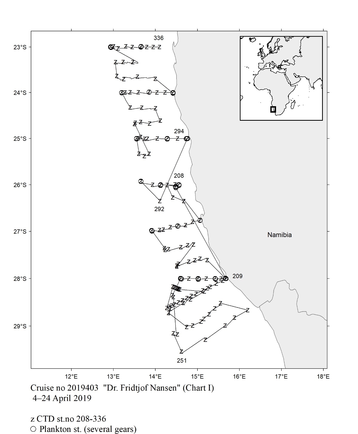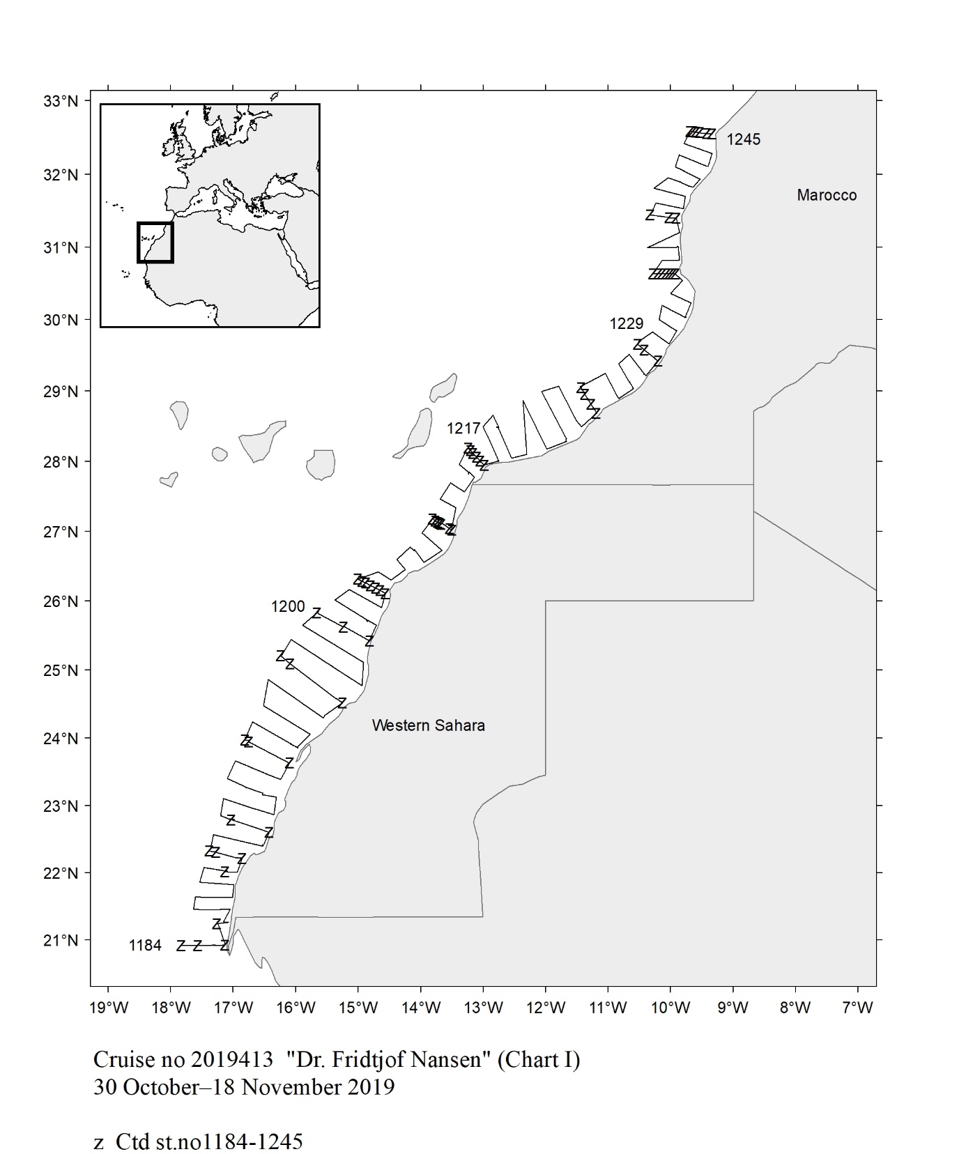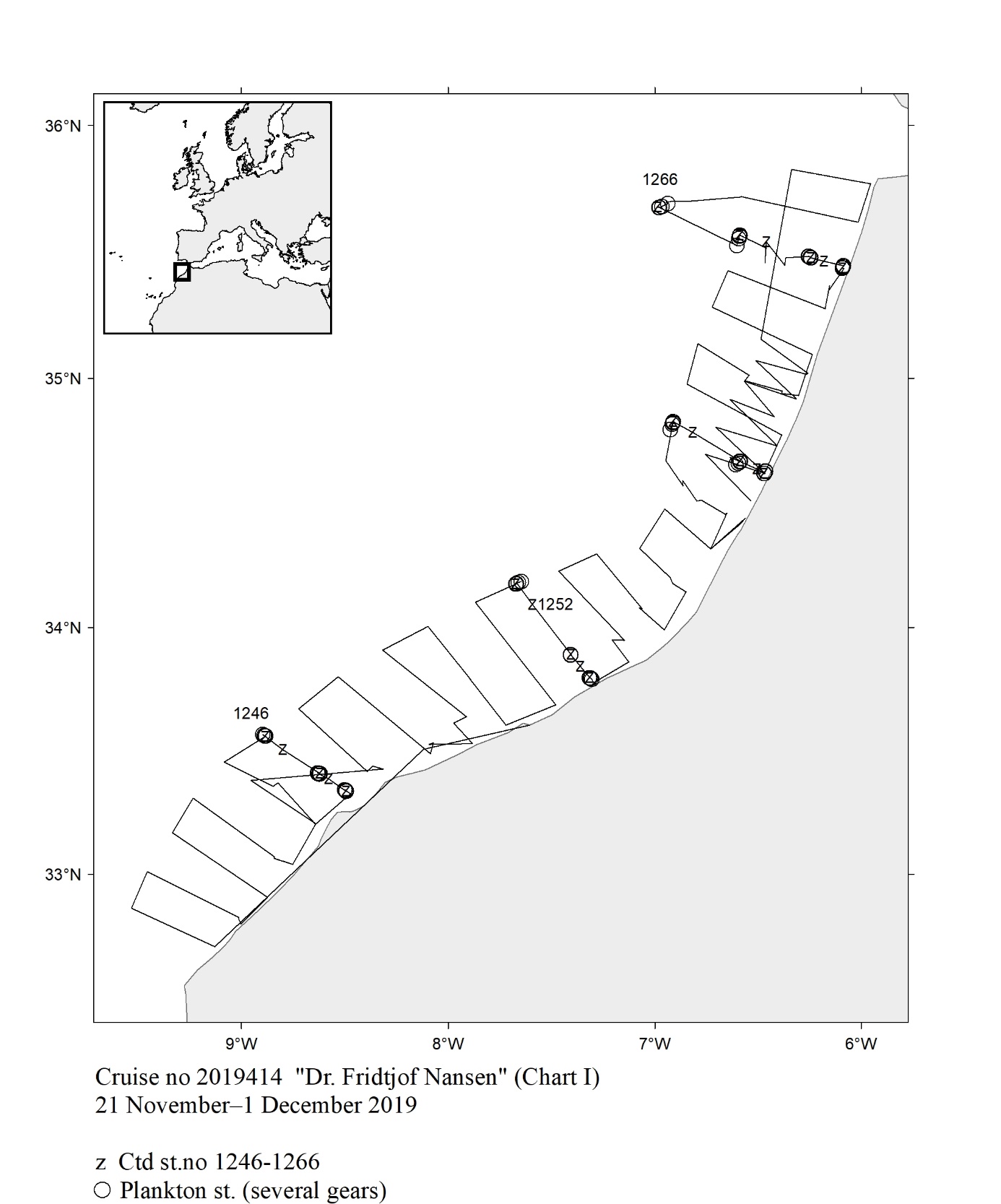 | 2019831 | 22.3.-8.4. | “ Kings Bay” | International blue whiting spawning stock survey. Acoustic survey to monitor the spawning stock of blue whiting on the spawning grounds west of the British Isles. | Northeast Atlantic Ocean | 1-27 | 16-26 | 133 |