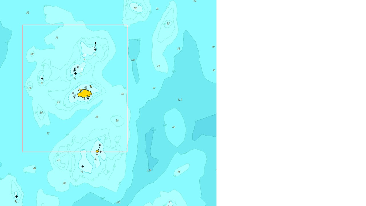 Figur 2: Bevaringsområdet med Store Klippeskjær sentralt og med grunne områder i Nordlige deler av bevaringsområdet. Klippeskjærsteinen er staken som står i sørgrensen for bevaringsområde. Den lyseste blåfargen markere områder grunnere enn 10m. Dybder mellom 10 og 50m er markert med samme lyseblå farge. Områder dypere enn 50m er mørkere blå.
