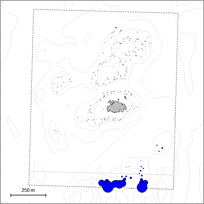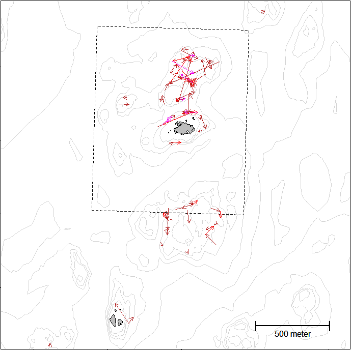 I Figur 10 er det vist den gjennomsnittlige sannsynlighetsfordeling som viser omfanget av områdene en typisk hummer vil oppholde seg på. Ofte vil man kalle området der et dyr oppholder seg på i 95% av tiden for dyrets hjemmeområde. Ettersom vi her har brukt 55 observasjoner vil dette området inneholde alle tilfeldige turer og er derfor i stor grad påvirket av enkeltobservasjoner. Området der en hummer vil oppholde seg 50% av tiden kalles ofte kjerneområde. Moland m.fl (2011) fant at akustiske merkede hummer i Flødevigen hadde et hjemmeområde som i snitt var ca 20 000 m2 og et kjerneområde på ca 3800 m2. Hjemmeområdet beregnet fra gjenfangster av hummer i Lindesnes er i dette tilfelle 73 000 m2 og kjerneområde 11 000 m2, noe som vil være hhv en faktor 3.6 og 2.9 ganger så stort. Dette kan skyldes at Moland fulgte hummer i underkant av et år, mens flere av disse gjenfangstene er gjort med ett til flere års mellomrom. Dette kan indikere at området vist i Figur 10 også til en hvis grad fanger opp episoder der hummeren ikke holder seg til samme skjulested, men flytter rundt.