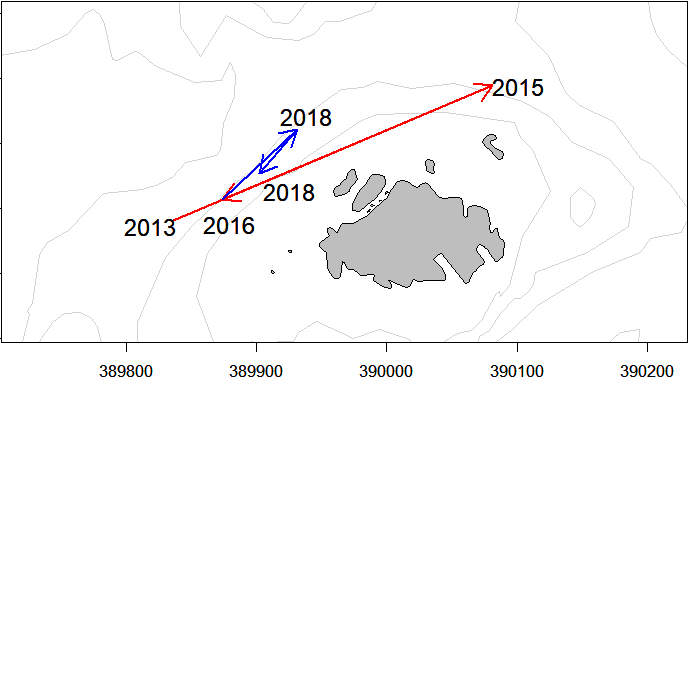 Figur 9: Figuren viser bevegelse for hummeren XH0541 med piler mellom observasjoner og årstall for de fem observasjonene som ble gjort av denne hummeren (merking og fire gjenfangster).