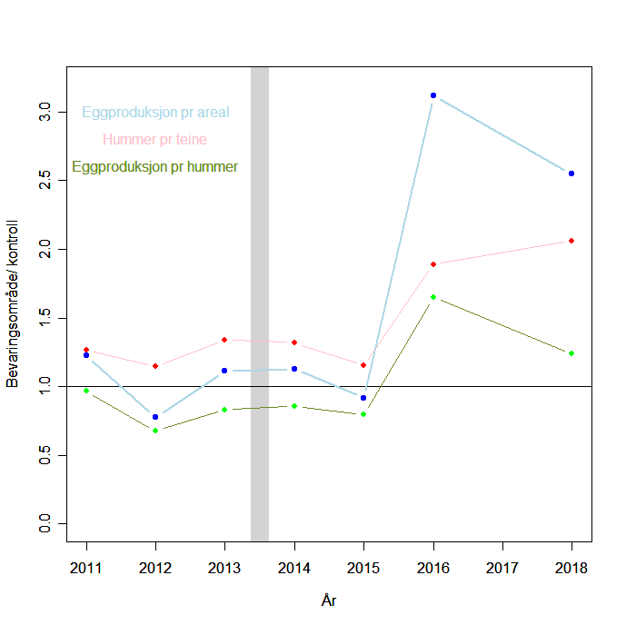 Vi har tidligere brukt hummer pr teine som bestandsmål og hvis vi antar at en teine fisker på et like stort areal uavhengig om den står innenfor eller utenfor bevaringsområdet kan vi bruke dette som mål på hummer pr areal. Antall hummer pr teine har hele tiden vært høyt i bevaringsområdet og før det ble innført bevaring var fangstene her 115-145 % av fangstene i kontrollområdene. De to siste årene har fangstene vært opp i dobbelt så høye i bevaringsområdet. Når vi kombinerer disse to tallseriene kan vi få et relativt mål på eggproduksjon pr areal.