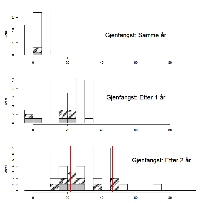 Figur 14: Vekst pr skallskifte hos hummer i Lindesnes. Forskjellen i lengde (i mm) mellom to fangstepisoder er vist på den horisontale aksen. Søylene tilsvarer antall i forskjellige intervaller av vekst. Åpne søyler tilsvarer hannhummer, skraverte søyler tilsvarer hunn-hummer, mens de fylte grå søylene tilsvarer hummer som er rognbærende ved første av de to fangstepisodene. En grå vertikal linje viser omtrentlig intervall av ett skallskifte. De røde vertikale linjene viser gjennomsnitt for antatt hhv 1 og 2 skallskifter.