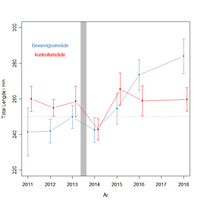 Det er siden 2010 målt lengde på totalt 837 hummer. Det er fanget hummer fra en totallengde på 15 cm og opp til 40.5 cm. Det er ikke forventet at teinene fanger representativt hummer av de aller minste størrelsene, men fra tidligere forsøksfiske etter hummer har vi observert fangster av hummer større enn 40.5 cm. Det er derfor ikke grunn til å tro at det er mange store hummere som ikke har vært mulig å fange. Det er ingen grunn til å tro heller at stor hummer har vært lettere å fange i bevarings- eller kontrollområde da de samme teinene er rullert mellom de forskjellige områdene. Utvikling i gjennomsnittsstørrelsen på hummeren i bevarings og i kontrollområdene er gitt i figur 5. De vertikale linjene viser usikkerheten i gjennomsnittet. Få observasjoner eller stor variasjon i totallengden på hummeren vil føre til større variasjon og lengre vertikale linjer. Ytterpunktene av de vertikale linjene angir intervallet der vi med 95% sikkerhet vil si at gjennomsnittet ligger. Når disse intervallene ikke overlapper for de forskjellige linjene er det grunnlag for å si at det er forskjell i størrelse på hummeren fra de ulike områdene. Vi ser at med unntak av ett år har det ikke vært noe forskjell på lengden på hummer i bevaringsområdene og utenfor. I 2012 var hummerne i kontrollområdet større enn i bevaringsområde og jevnt over så dette ser ut til å være mønsteret de andre årene før fredning. Fra 2014 har det vært en jevn økning i størrelsen på hummeren i bevaringsområdet og i 2018 er denne forskjellen tydelig og signifikant.