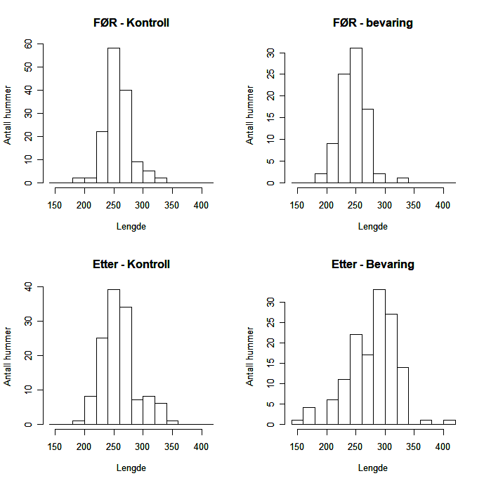 Gjennomsnittslengde kan være et upresist mål å bruke på utvikling i lengden på hummeren i hummerbestanden. Dersom mange hummere blir store, men det også kommer mange(?) små hummer vil gjennomsnittet forbli mer eller mindre det samme. Det kan likevel være en viktig biologisk verdi i å ha mange hummere i forskjellig alder og størrelse, enn å ha mange hummere like over minstemål. Ved å tegne histogrammer av lengder hos hummeren før og etter bevaring og innenfor og utenfor bevaringsområdet kan vi også studere utviklingen.