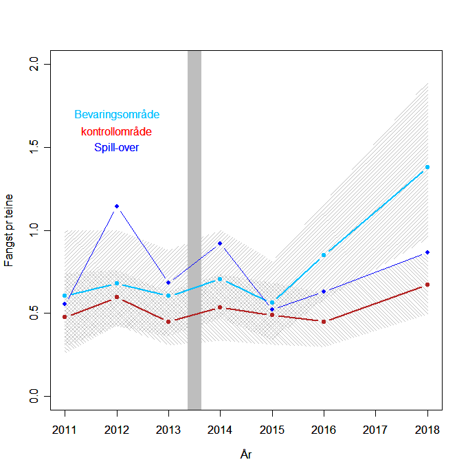 Figur 4: Fangsten av hummer i bevaringsområde økte mer enn i kontrollområde i tiden etter fredning. Den røde linjen er hummerfangst pr teine i kontrollområde. Den mørkeblå linjen er hummerfangst pr teine i område rett sør for grensen til bevaringsområde. Den lyseblå linjen er hummerfangst pr teine i bevaringsområde. Et skravert område marker usikkerheten til linjen knyttet til bevaringsområde og et skravert område viser usikkerheten i linjen knyttet til kontrollområde. Den grå loddrett linje viser når bevaringsområde ble etablert.