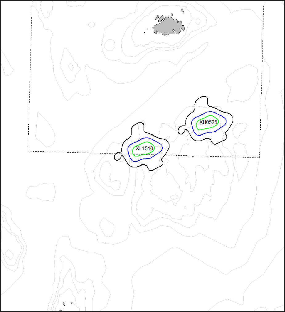 Figur 11: Kartet viser den sørlige grensen for bevaringsområde rundt klippeskjærsteinen og to hummere hhv nummer XL1510 og XH0525 som har fått et standardisert hjemmeområde lagt over sin fangstposisjon (bare polygoner tom 75% er vist i figuren). Dette viser at den nordligste av disse, XH0525, mest sannsynlig er godt beskyttet av hummerfredningen, mens den sørlige, XL1510, vil deler av tiden kunne oppholde seg utenfor bevaringsområde og bidra til en «spill-over» effekt.