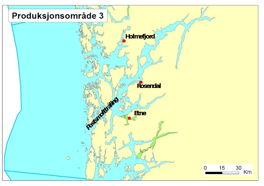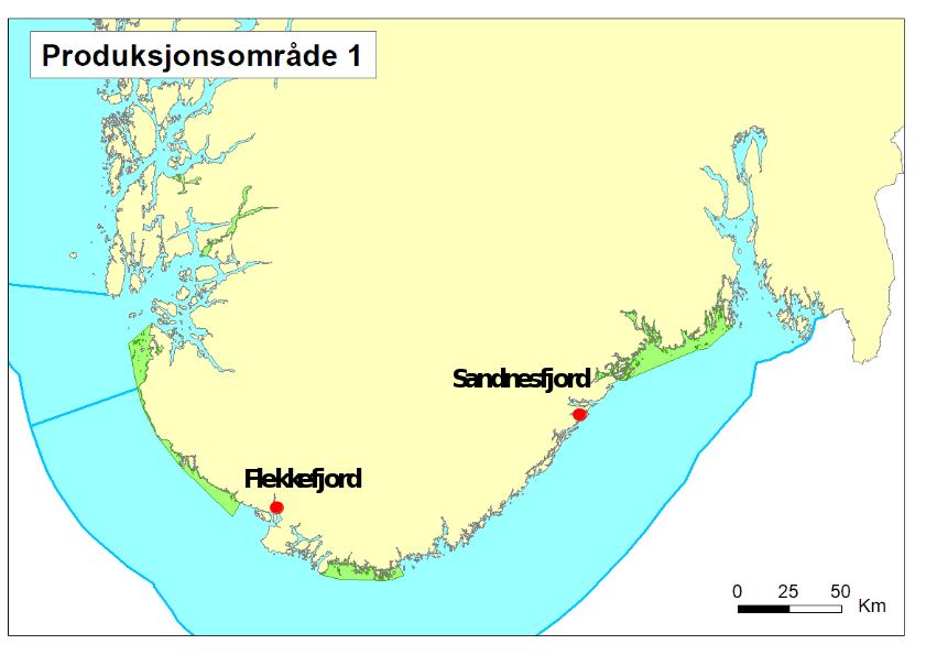 Sandnesfjord i Aust-Agder er valgt som fast stasjon i produksjonsområdet på Sørlandet, og har tidligere vært undersøkt gjennom flere år i overvåkingsprogrammet som en sørlig referanse i et område uten nærliggende oppdrett av laksefisk. I tillegg ble det gjort en undersøkelse ved Flekkefjord i Vest-Agder, som er området med høyest tetthet av lakseoppdrett i dette produksjonsområdet (figur 2). Data fra begge stasjoner presenteres i denne rapporten.