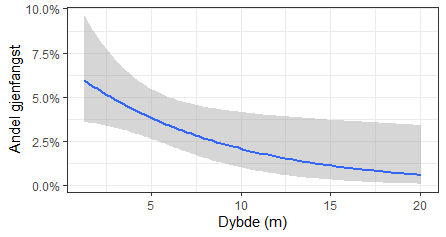 Figur 11: Gjenfangstandel hos bergnebb fanget i teine som en funksjon av fangstdyp. Predikert verdi fra en logistisk regresjonsmodell og 95 % konfidensintervall.