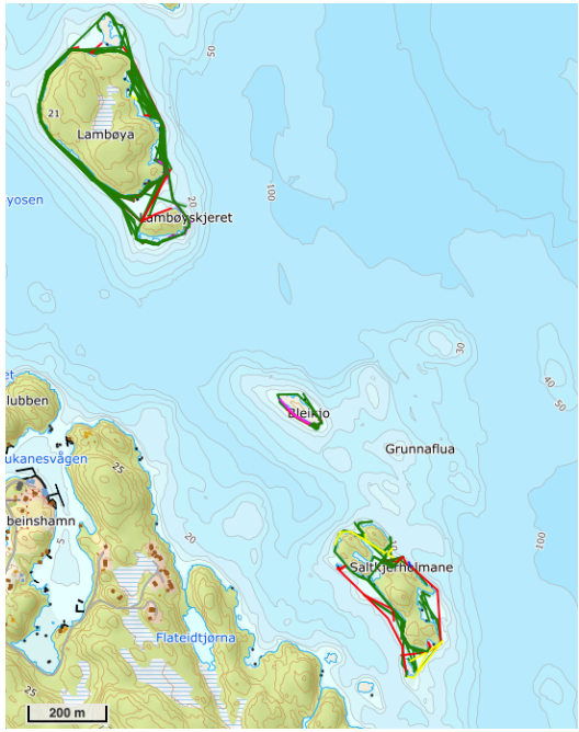 Romlige analyse av gjenfangstdata fra 2017-2018 ble gjort av Nicolai Aasen som tok masteroppgave på dette temaet. Et sentralt funn var at ingen av artene beveget seg mellom de tre øyene – den korteste avstanden mellom to av øyene var 270 meter med maksdyp på 25 meter. Grønngylte hadde den lengste registrerte horisontal vandringen (maks. 592 m, snitt 121 m), etterfulgt av bergnebb (maks. 386, snitt 42 m) og berggylte (maks 336 m, snitt 105 m). Dette gir klare indikasjoner på at selv små dyp (25 m) begrenser horisontal bevegelse for leppefisk (Figur 10).