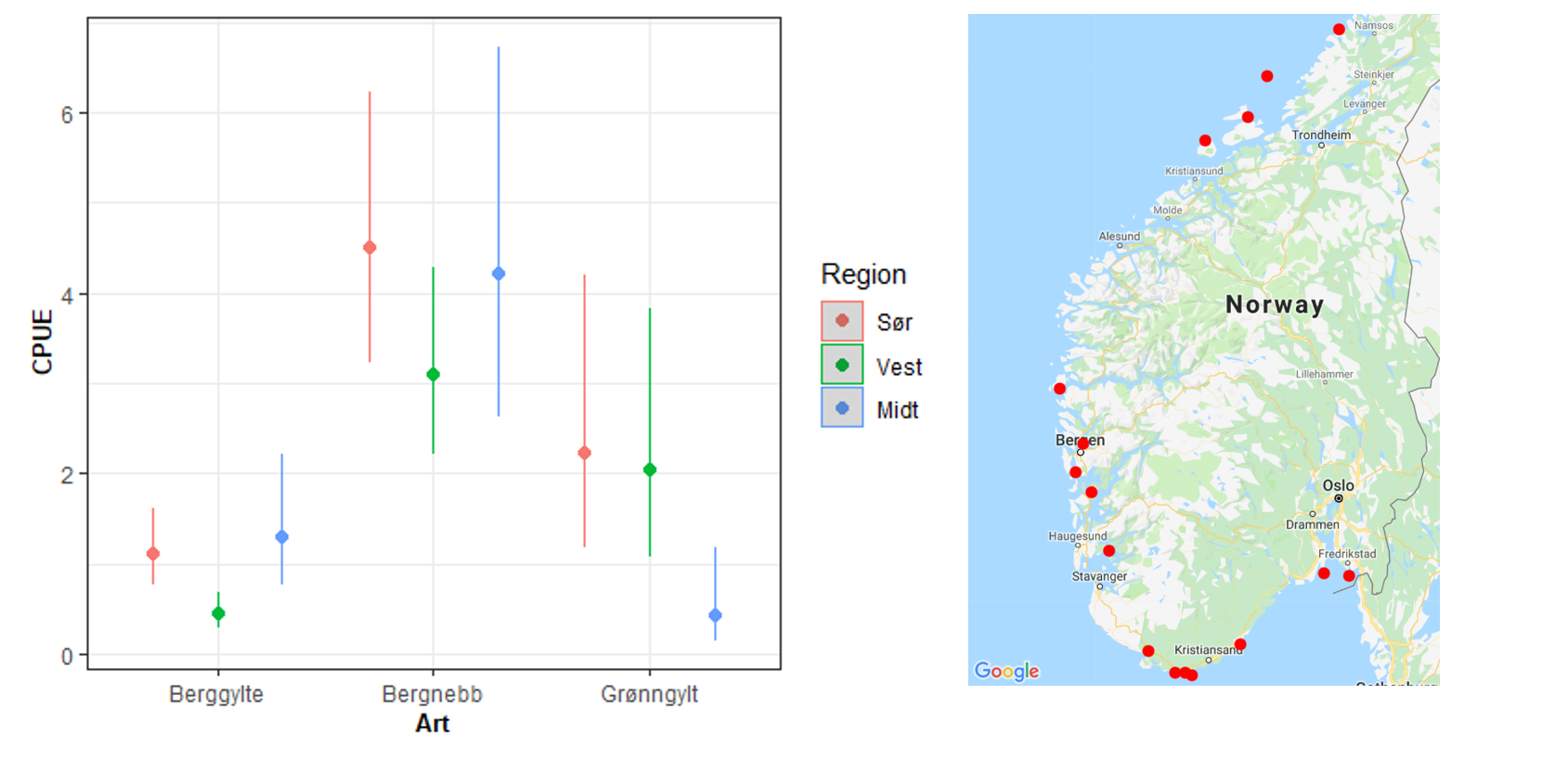 Figur 6: Venstre; CPUE (95 % konfidensintervall) for de tre artene i de tre regionene i 2019, estimert ved GLMM (tabell 2). Høyre: Fordelingen av de 16 referansefiskerne i 2019.