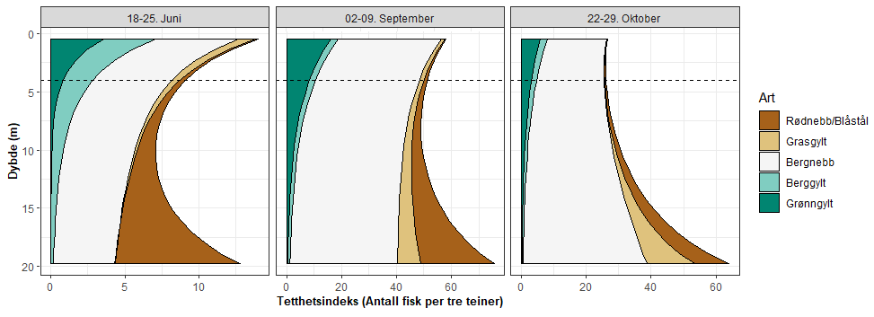 En sentral del målsetning i prosjektet var å undersøke forekomsten av leppefisk langs dybdegradienter. Fisket etter leppefisk var antatt å foregå på 1-7 meters dyp siden fisk fanget på dypere vann får oppblåst eller i verste fall ødelagt svømmeblære når redskapen trekkes (Halvorsen et al. 2016b, 2017). I dagens praksis blir fisk som viser tegn på dette (svimere med buk i været) sluppet ut med ukjent grad av overlevelse. Dybdefordelingen til leppefisk har vært lite undersøkt, men det er rapportert at grønngylte er mest tallrik på 0-10 meters dyp, mens bergnebb og berggylt kan opptre ned til 30 meters dyp (Dipper et al. 1977; Sayer et al. 1995; Sayer and Treasurer 1996). Det er påvist høyere tetthet av bergnebb på 10 og 18 meter enn på 5 meter (Skog et al. 1994). Dette kan tyde på kan være store forekomster av bergnebb og berggylt som ikke beskattes i dagens fiskeri, noe som vil være viktig informasjon for forvaltning av leppefisk. Samtidig vil det kunne avdekkes om det er muligheter for å øke fangsteffektivitet for fiskerne ved å bedre tilpasse fiskedypet.