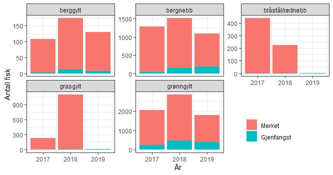 Figur 9: Oversikt over antall merket fisk per art per år i forsøksområdet på Austevoll. Blåstål/rødnebb og Grasgylt ble ikke merket i 2019. Grønn farge viser antall individer som er gjenfangster.