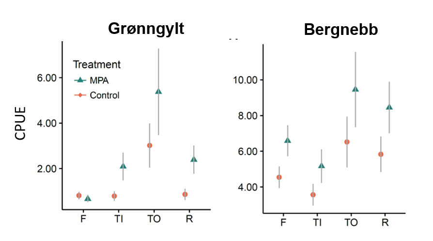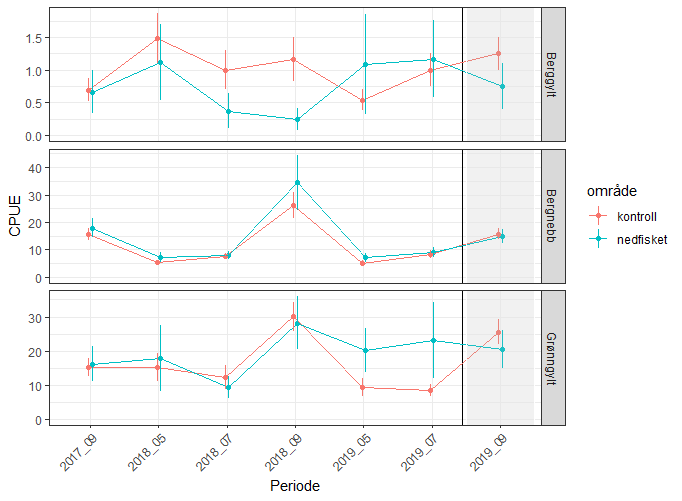 For å undersøke hvor stor andel av bestanden som tas ut under et intensivt teinefiskeri, ble det gjennomført et eksperimentelt fiske på den minste av øyene (Bleikjo, 320 m kystlinje) i August 2019. Det ble fisket med totalt 240 teiner over to uker og alle leppefisk over minstemål (grønngylte, berggylte og bergnebb) ble fjernet fra populasjonen (totalt 992 individer). Vi benyttet et BACI-design (before-after, control-impact) for å undersøke endringer i CPUE, før og etter nedfiskingen, hvor den andre øye som ikke ble fisket var kontrollområde. Det var relativt små endringer i CPUE, dog i forventet retning for alle tre arter (relativt lavere CPUE på den nedfiskede øya; Figur 12). De største forskjellene ble observert for grønngylte og berggylte.
