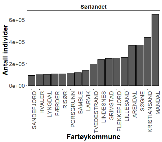 Figur 1: Fangst i 2018 på Skagerrakkysten fordelt på fartøykommune. Her er kun kommuner med fangst over 100.000 leppefisk tatt med. Data fra fiskeridirektoratets sluttseddelstatistikk.