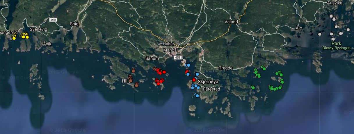 Figur 4: Fangstområder i Agder, de ulike fargene henviser til ulike fiskere. Fiskerne valgte selv ut lokalitetene innad områder de fisker i det ordinære fiskeriet.