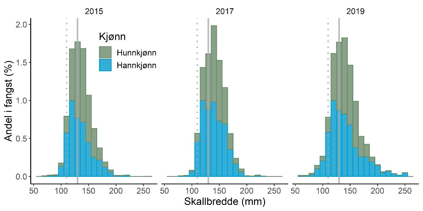 Skallbredde varierer over tid og mellom de statistiske områdene, men gjennomsnittsstørrelsen har vært stabil over hele studieperioden fra 2001 til 2019 (Figur 5). Det samme ser vi fra størrelsesfordelinger fordelt på kjønn (Figur 6). Endringene over tid er uten klare trender, ubetydelige, og skyldes sannsynligvis naturlige svingninger. Størrelsene på krabber fanget i 2019 ligger på langtidsgjennomsnittet.