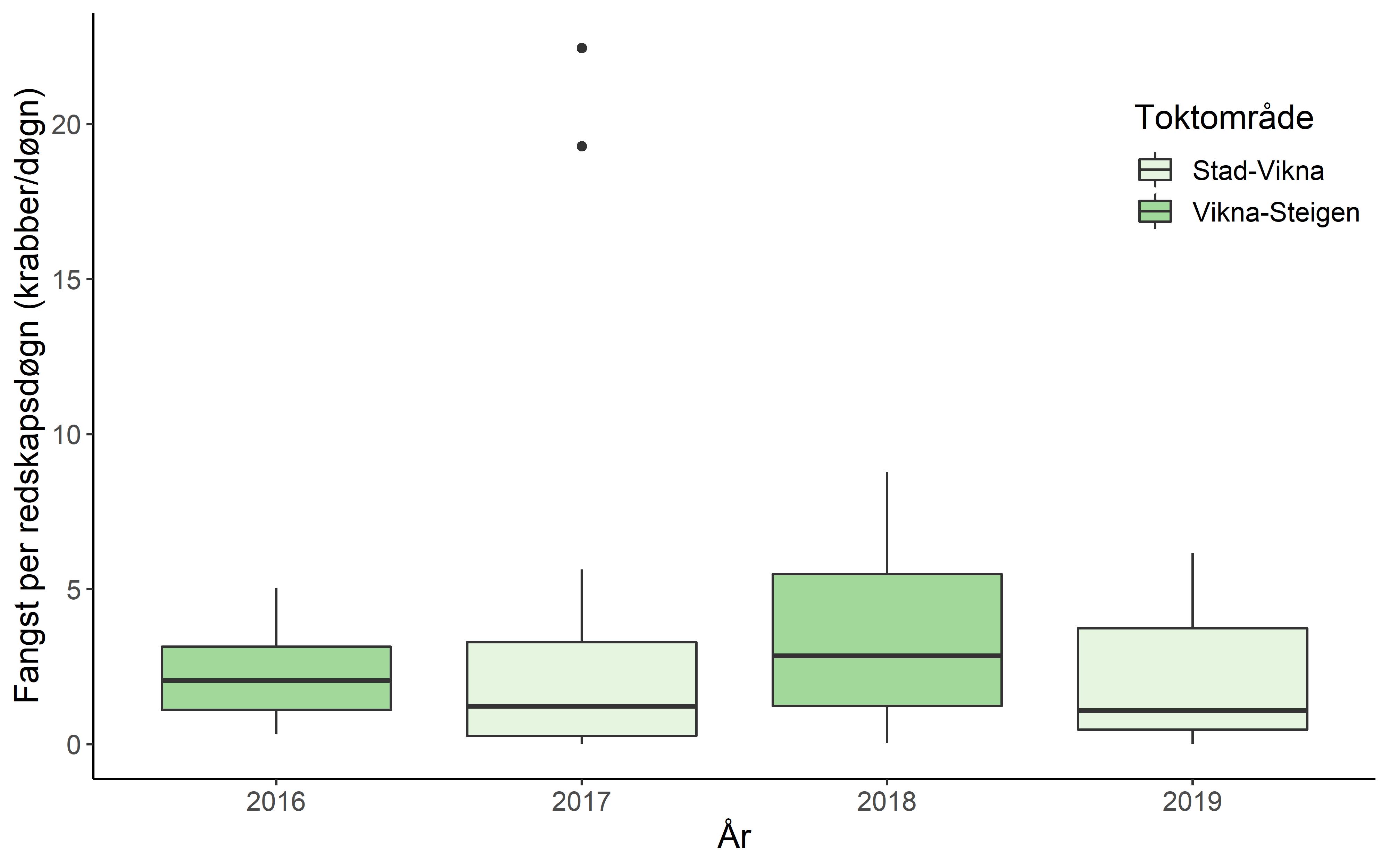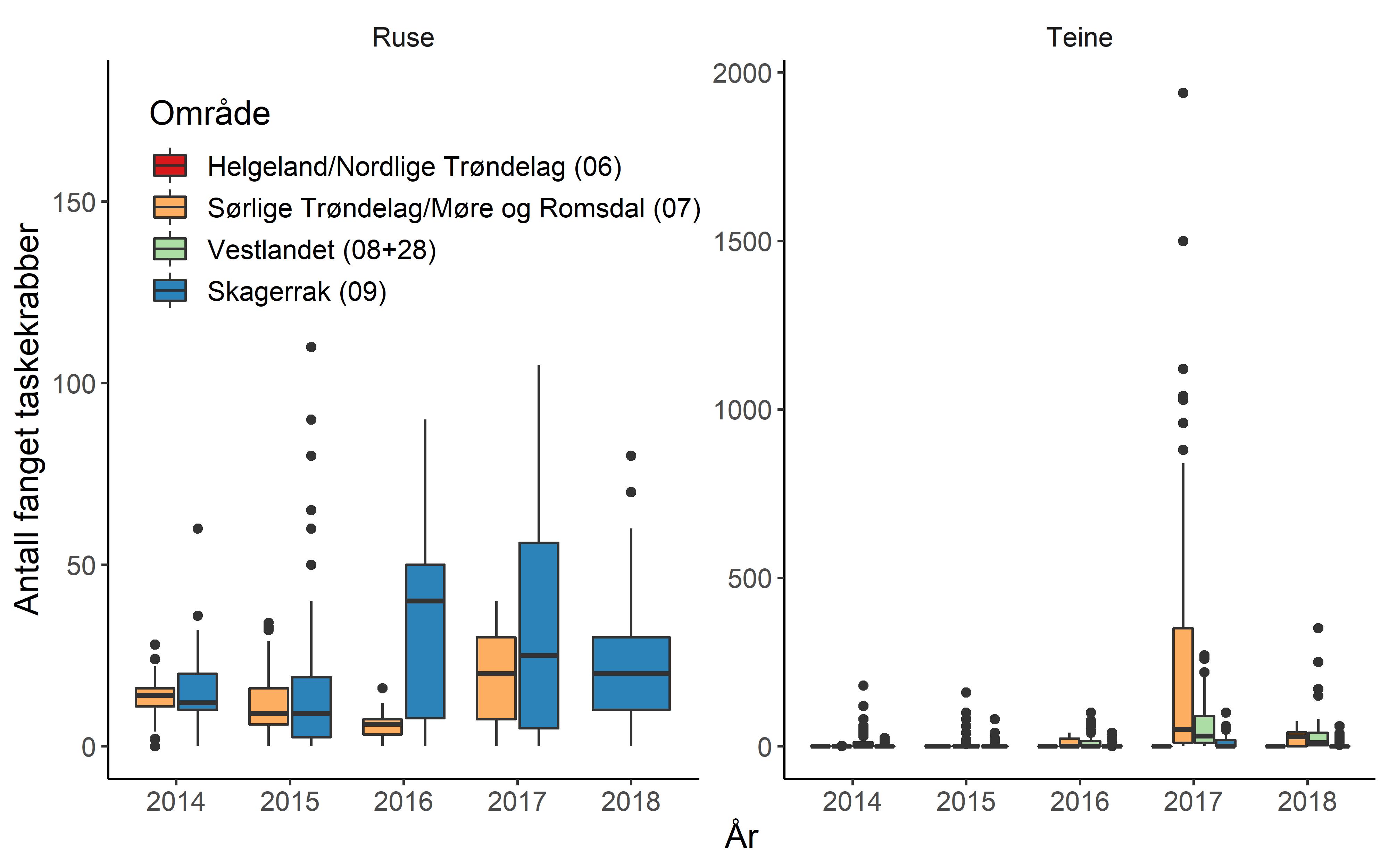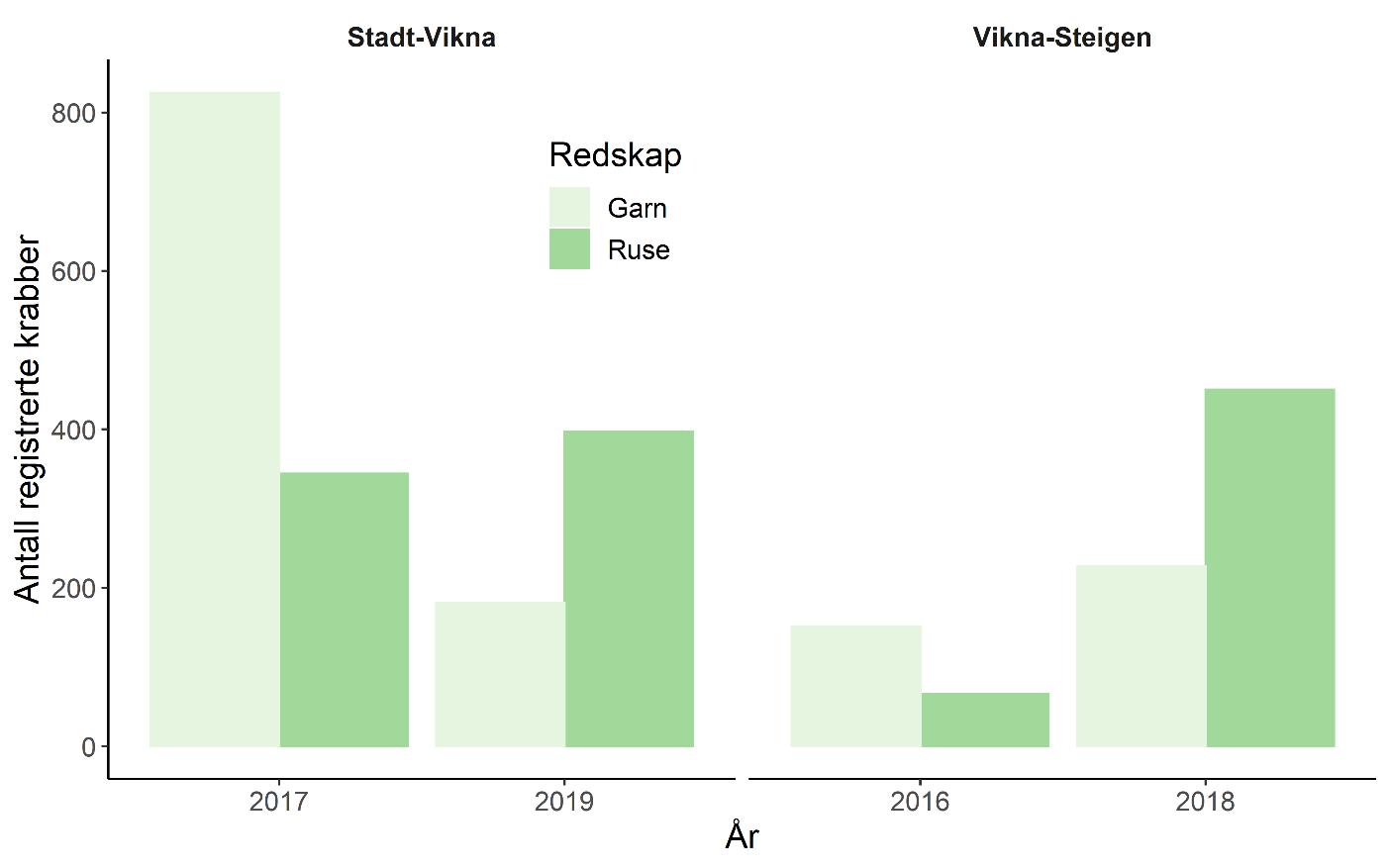 HIs garn- og rusetokt har blitt etablert for å kartlegge forekomster av kysttorsk og andre kystnære arter i grunne områder, som ikke kartlegges av det årlige kysttoktet. Etter et pilotprosjekt i 2011-2012 startet garn- og rusetoktet opp i den formen det har nå i området mellom Stadt (Møre og Romsdal) til Steigen (Nordland) som korresponderer til de statistiske områdene 07, 06 og deler av 00. Toktet dekker området fra Stadt til Vikna (Nord-Trøndelag) og fra Vikna til Steigen annethvert år. På hver stasjon brukes en kombinasjon av to garnsettinger med fire trollgarn i dybdeområdet 15-30 m og 6 settinger med to doble åleruser knyttet sammen i dybdeområdet 2-15 m. Pilotprosjektet viste at å løfte trollgarna fra bunnen ved hjelp av ekstra tamper, reduserte problemet med bifangst av taskekrabbe og ødelegging av fiskefangsten og garn. Det registreres fortsatt mye taskekrabbe i begge redskapstypene og i begge toktområdene (Figur 9). På dette grunnlaget har det blitt antatt at garn- og rusetoktet kan gi tilleggsinformasjon om krabbebestanden i hovedområdet for fiskeriet. Her presenterer vi en foreløpig analyse av årene 2016-2019. Data fra 2013-2015 ble ikke inkludert på grunn av begrenset tid som ikke tillot en fullstendig kvalitetssikring og analyse.