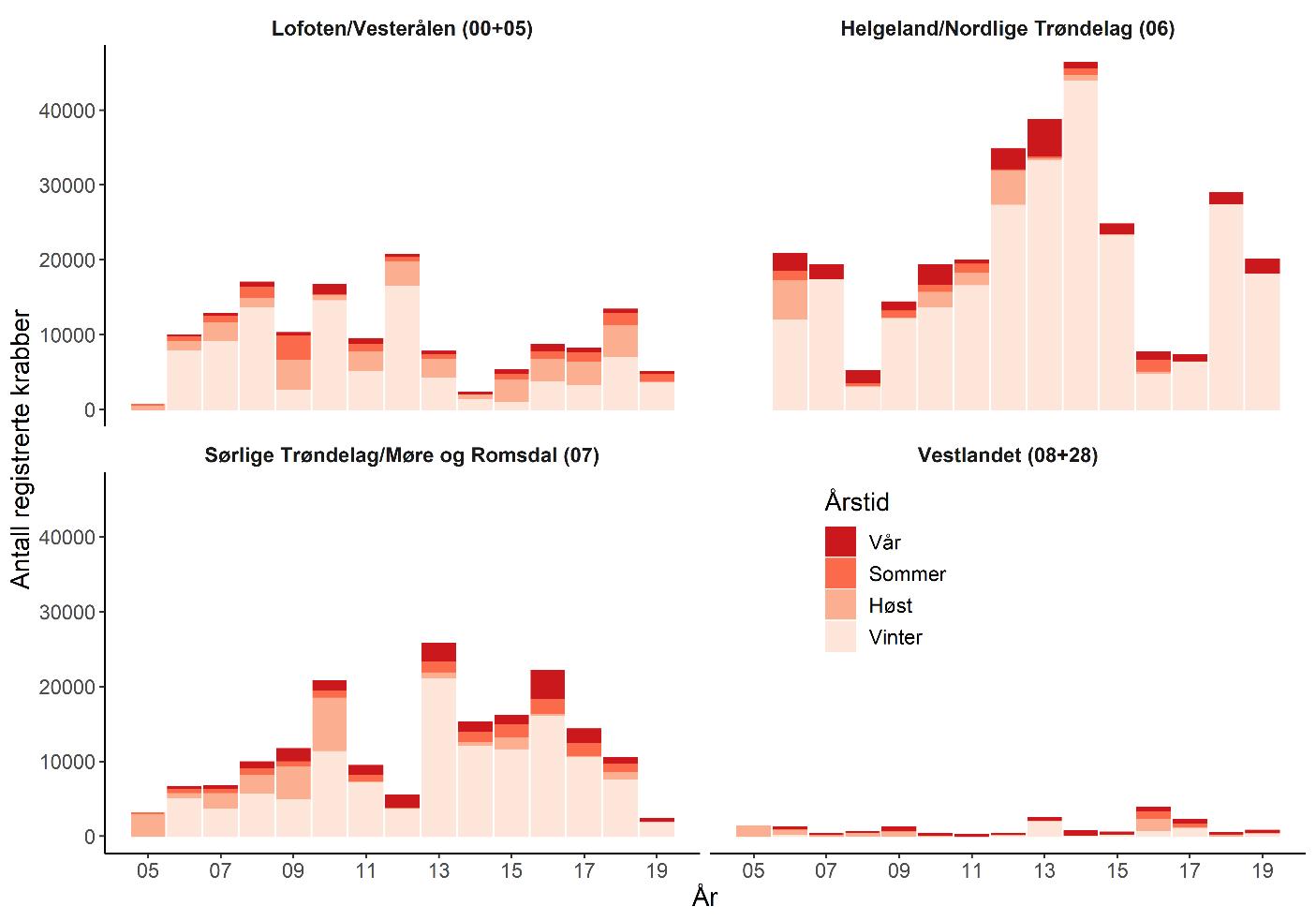 Figur 11: Totalt antall taskekrabber registrert som bifangst i referanseflåten kyst per år, årstid og statistisk område.