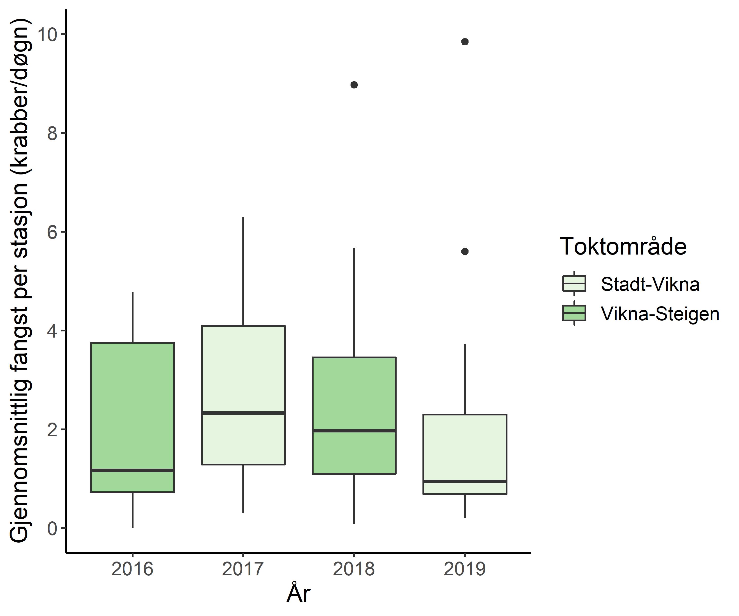 Bifangst av taskekrabber registrert fra garn- og rusetoktet viser en stor variasjon innenfor hvert område, og mellom år (Figur 10), spesielt inkluderer tidsserien et høyt antall stasjoner hvor en del av redskapene kom opp uten taskekrabber. Siden toktet er standardisert til en konsistent bruk av samme redskap og ståtid, kan vi bruke gjennomsnittet for hvert fiskested (kombinasjon av fire trollgarn og seks åleruser) som en representativ fangstrate per stasjon. Disse fangstratene viser en mulig, men statistisk ikke-signifikant trend over tid med motsatt retning for de to områdene: for Stadt til Vikna sees en nedgang i fangstratene mens endringen for Vikna til Steigen er positiv.