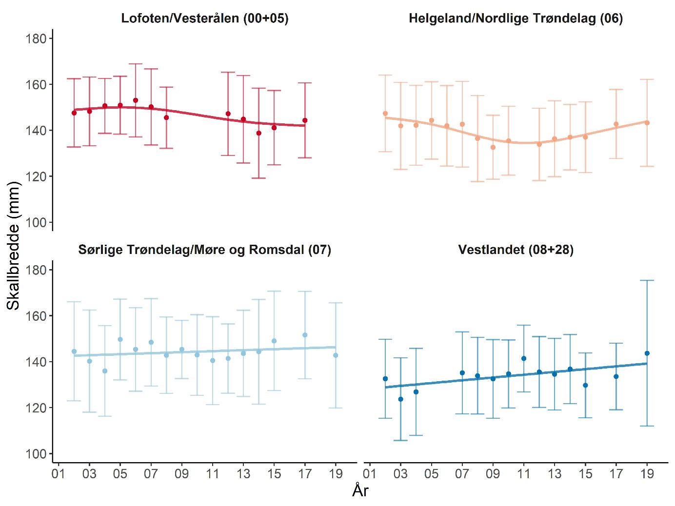 Figur 5: Skallbredde på lengdemålte taskekrabber fisket av referansefiskerne per år og statistisk område (Lofoten og Vesterålen, Helgeland og Nord-Trøndelag, Sør-Trøndelag og Møre og Romsdal, og områder sør for Stadt). Punktene er gjennomsnittlig skallbredde med standardavvik, og de heltrukne linjene viser trender over tid estimert ved hjelp av generaliserte additive modeller (GAM).