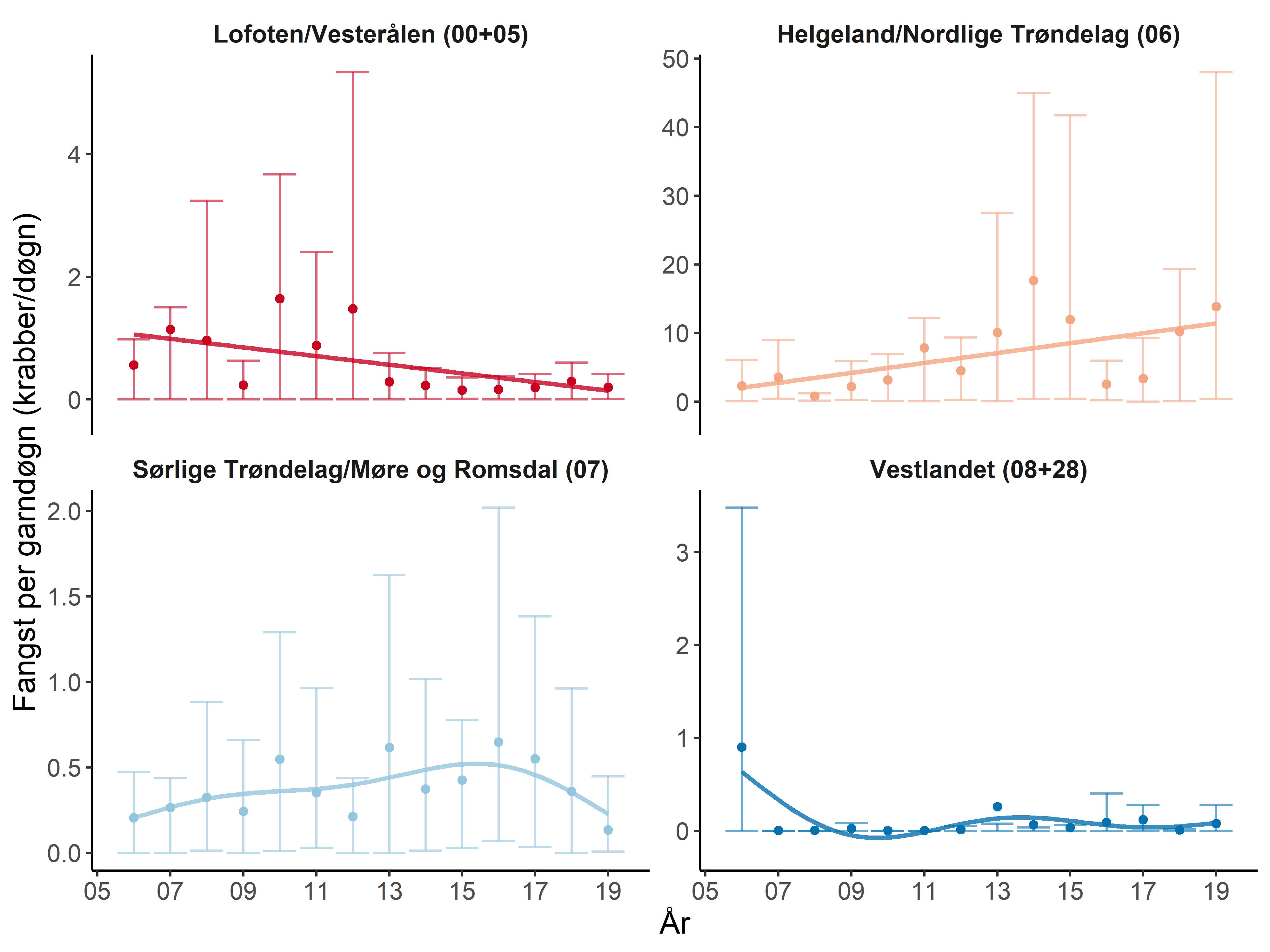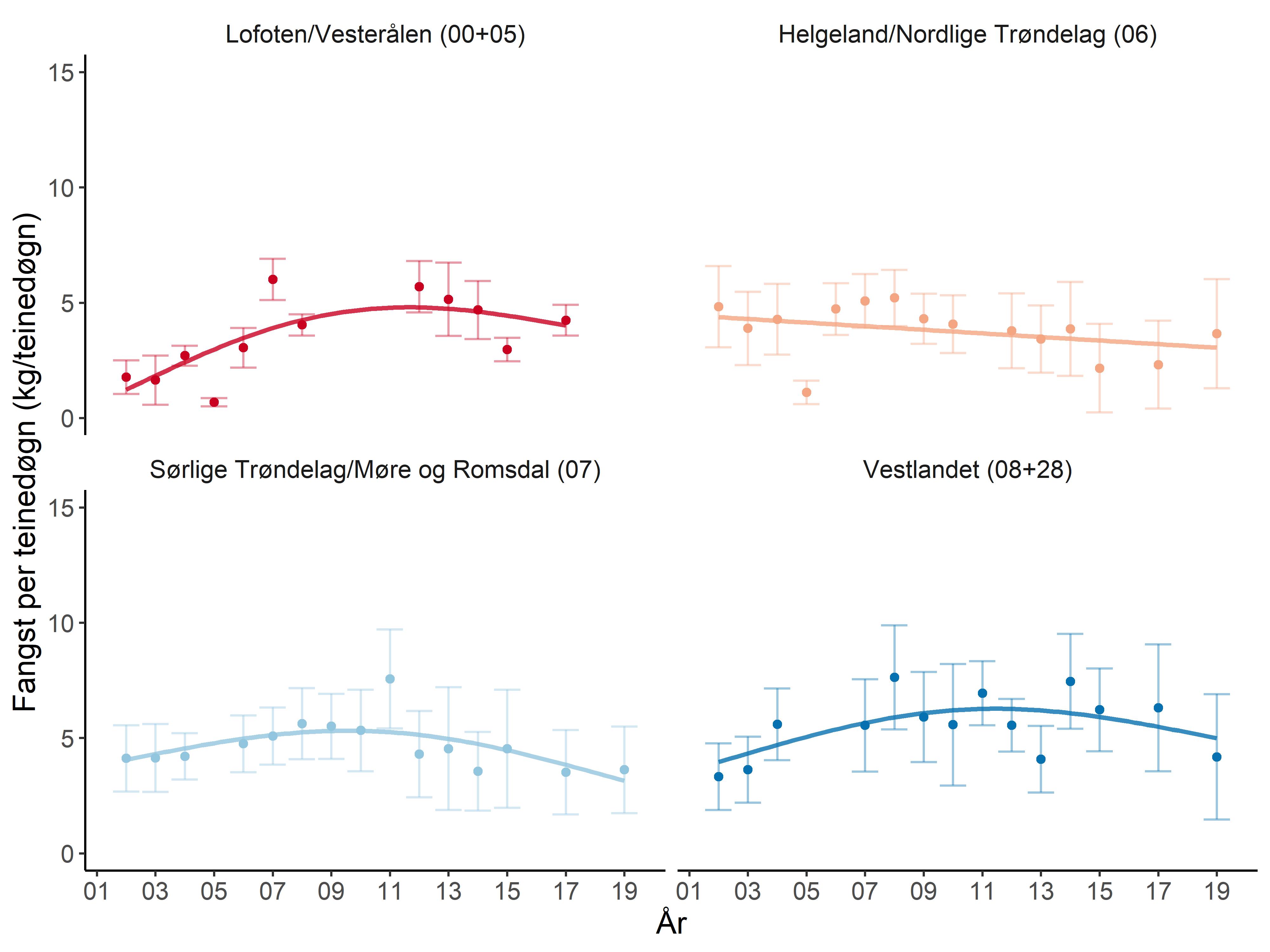 Figur 7: Landet fangst i vekt per teinedøgn per år og statistisk område (Lofoten og Vesterålen, Helgeland og Nord-Trøndelag, Sør-Trøndelag og Møre og Romsdal, og områder sør for Stadt). Punktene viser gjennomsnittlig fangst med standardavvik, de heltrukne linjene viser trender i fangst per teinedøgn over tid estimert ved hjelp av generaliserte additive modeller (GAM). Datapunktet for 2019 i figuren fra Vestlandet er basert på bare én fisker og er derfor ikke nødvendigis representativt for området i 2019.