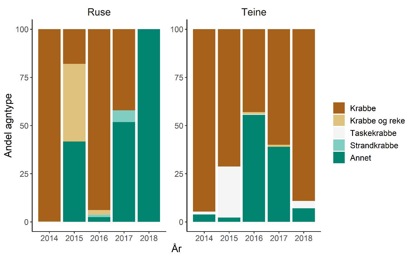 Agnbruk i leppefisk-referanseflåten antyder en signifikant bruk av taskekrabber og andre krabber i leppefisk-fiskeriet (Figur 15). Forbruket av krabber til agn i rusefisket har minket til null i 2018, men i teinefisket er krabber fortsatt den dominerende agnsorten. I stor grad har fiskerne ikke oppgitt hvilken krabbeart de har brukt og dataene tillater derfor ingen klare konklusjoner, men vi kan anta at en stor andel av uspesifisert krabbeagn er taskekrabbe. Generelt indikerer dataene ingen økning i bruk av taskekrabbe til agn i leppefisk-fiskeriet, men bekrefter at en signifikant mengde av taskekrabber er landet og brukt til agn.