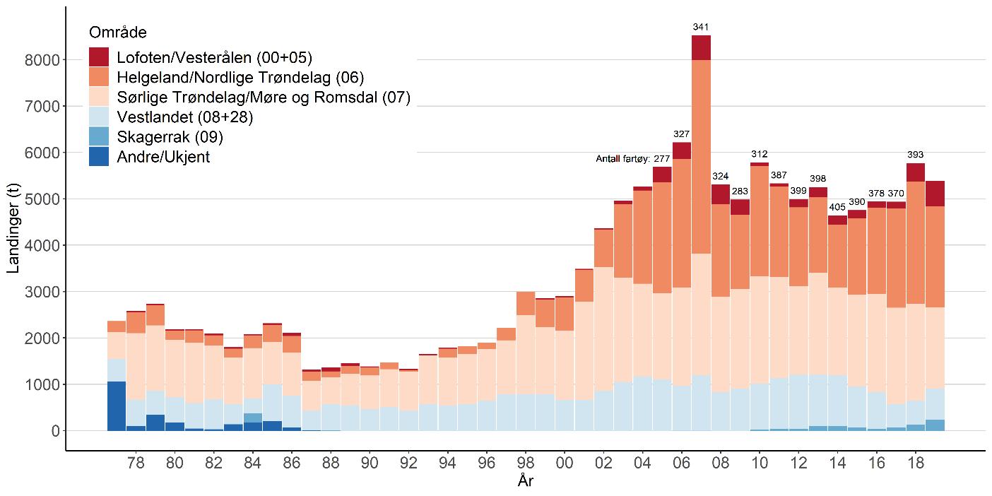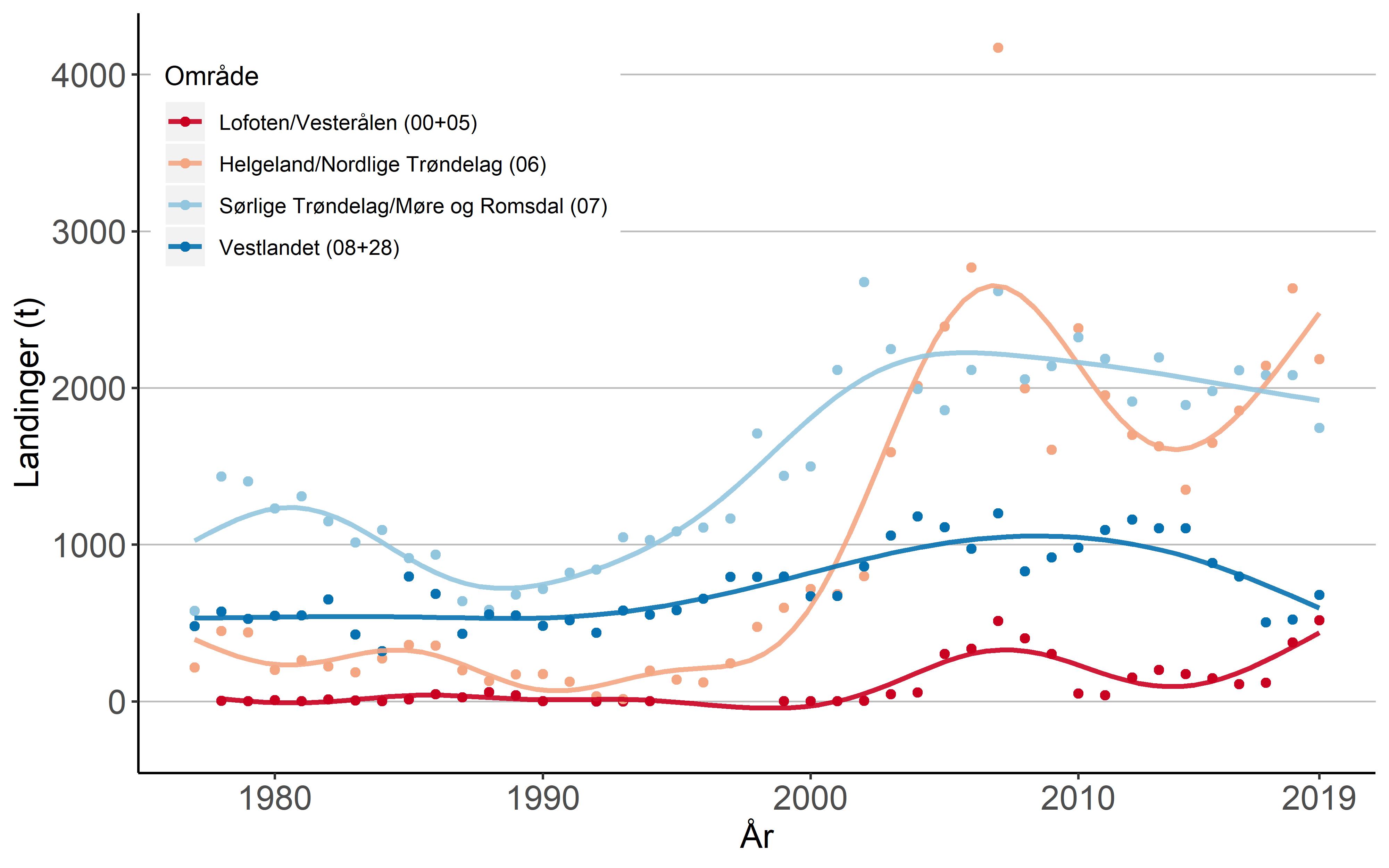 Utviklingen i landinger er ulik mellom de statistiske områdene (Figur 4), spesielt mellom de to viktigste fiskeområdene: område 07 viser en mulig negativ trend og en nedgang i 2019, mens område 06 har vist en økning de siste årene. Det er også en motsetning mellom Vestlandet sør for Stadt (08 og 28), som viser en nedgang i innrapporterte landinger, og de nordlige områdene 00 og 05 som viser en økning i landinger. Nedgangen på Vestlandet kan delvis forklares med at en viktig krabbefabrikk gikk ut av drift.