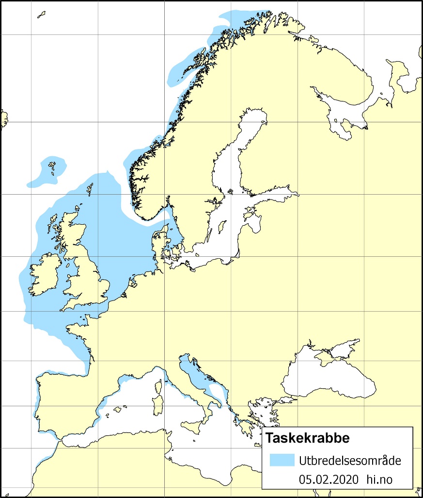 Figur 1: Taskekrabben er utbredt i store deler av Europa. Den finnes langs norskekysten, vestkysten av Sverige, ved Danmark, Nederland og Belgia, i havområdene rundt Irland og Storbritannia, og langs kysten av Frankrike, Spania og Portugal. Noen individer er også funnet langs kysten av Marokko, sør for Gibraltarstredet. Inne i Middelhavet forekommer den sporadisk langs nordkysten, helt inn til Egeerhavet.