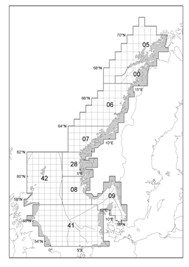 Figur 2: Fiskeridirektoratets statistiske områder: 05 er Vesterålen, 00 er Lofoten, 06 er Helgeland og nordlige Trøndelag, 07 er sørlige Trøndelag og Møre og Romsdal, 28 er Sogn og Fjordane og Nord- og Midthordaland, 08 er Sunnhordaland og Rogaland, og 09 er Skagerrak.