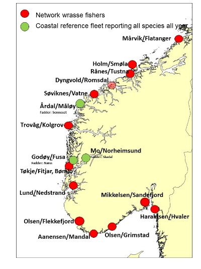 En stor økning i fisket etter leppefisk de siste årene har medført et kunnskapsbehov som ikke dekkes av referanseflåten kyst. Derfor ble et nettverk av leppefisk-referansefiskere etablert i 2011, som er et tillegg til fiskere i referanseflåte kyst som fisker etter leppefisk. Opptil 21 fiskere deltar i leppefisk nettverket (Tabell 1) og fisker med ruser eller teiner fra Skagerrak i sør til Sør-Trøndelag i nord (Figur 13), etter hvert mest teiner, og registrerer blant annet utkast av undermåls leppefisk og andre arter, og agntype. Datasettet inneholder derfor relevant informasjon om bifangst av taskekrabber og bruk av taske- og strandkrabber som agn. Et økende forbruk av krabber som agn i et økende leppefisk-fiskeri er antatt å medføre et økt fiskepress på taskekrabbebestanden.