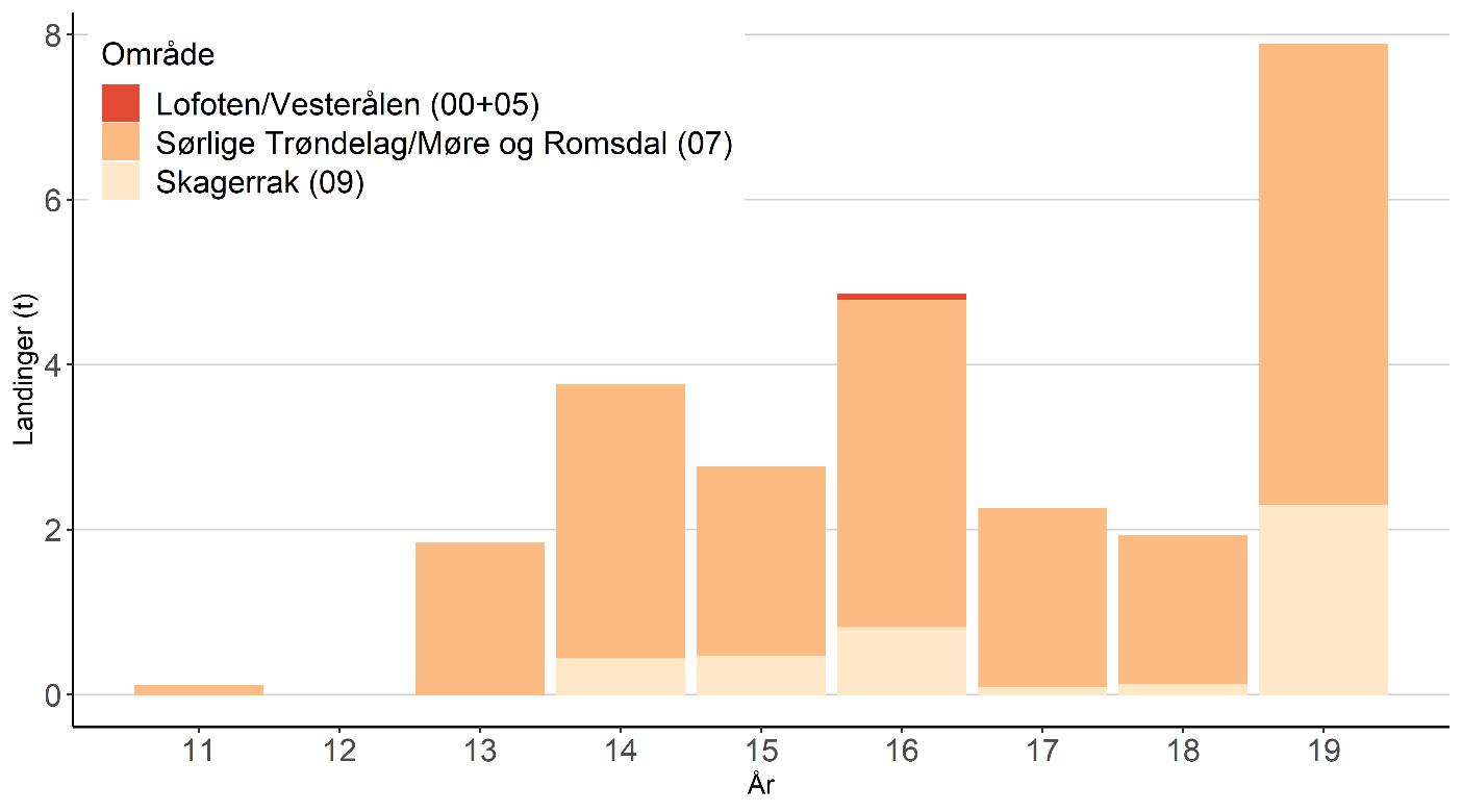 Fisket etter taskekrabbe har landet relativt stabile fangster de siste 12 årene, og i gjennomsnitt har det vært landet rundt 5000 tonn fordelt på de forskjellige statistiske områdene (Figur 3). Etter et toppår i landinger i 2007, har landingene variert mellom 4629 og 5773 tonn (Figur 3). Landingene for 2018 var med 5758 tonn betydelig over gjennomsnittet, og 2019 med 5370 tonn bekrefter en økning de to siste årene.