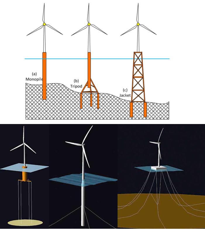 Figur 3: Øverst: Ulike typer bunn monterte vindturbiner. Til nå er de aller fleste vindturbiner montert på havbunnen ved relativt grunne dyp på opptil 50 meter. Monopåle der en påle/stålrør blir banket ned i havbunnen er mest vanlig, men kan bare brukes grunnere enn 30 m. Alternativ som kan brukes mellom 30 - 50 m er tripod med tre påler og eller en “jacket” med fire påler. (Figur fra Plodpradit, 2019). Nederst: Ulike typer ankersystem for flytende vindturbiner. Venstre: Tension leg platform, vertikale, lite elastiske, forankringer som hindrer vertikal bevegelse. Midten: Sparbøye, vertikal flytende bøye med anker til bunnen. Hywind (Skottland, Tampen, og Test/Demo ved Karmøy) er av denne typen. Høyre: flytende lekter med slakke ankerkabler til bunnen. (Figur fra Jonkman et al. 2011).