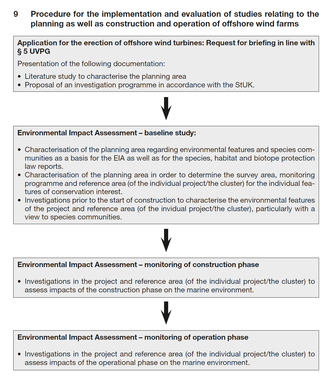 I Tyskland kreves det gjennomføring av sammenhengende “baseline” studier over to hele sesonger før konstruksjon av vindkraftanlegg, med krav om et tredje år i tillegg hvis perioden mellom baseline studien og konstruksjon av anleggene er over to år. Etter dette blir det anbefalt overvåkning under selve konstruksjonsfasen og over en periode fra 3 til 5 år etter at anlegget er satt i drift. Det er krav om gjennomføring av sammenlignbare miljøundersøkelser/overvåking i prosjektområdet og minst et upåvirket referanseområde i disse periodene. Det er spesifikke og detaljerte krav til metoder og evaluering av data for bunnlevende organismer, fisk, fugl, flaggermus, og marine pattedyr.