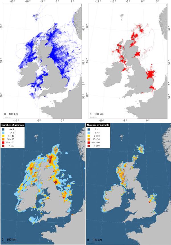 Vindkraftanlegg øker støy i områder både under utbygging og under driftsfasen (se avsnitt 3.5). Flere rapporter har nylig beskrevet effekten og kunnskapshull om effekter av støy i utbyggingsfase (Thomsen et al. 2016; Copping og Hemery 2020), og vi skal kort oppsummere kunnskapen nedenfor. Det blir ofte argumentert med at fordi støy produsert i utbyggingsfase er mye høyere en støy produsert i driftsfasen, er risiko for påvirkning høyere i driftsfasen. Men, mens utbyggingsfasen er avgrenset over tid, kan kontinuerlig lyd under driftsfasen øke støynivået i havområder i flere år. Dette kan spesielt påvirke de dyrene som lever i eller nær vindkraftanleggene (Tougaard et al. 2009; Marmo et al. 2013). Mange dyr, fra krepsdyr til hval, kan bli forstyrret av lydendringer (f.eks. Hawkins og Popper 2017; Popper og Hawkins 2019; Kvadsheim et al. 2020). Støy kan dermed påvirke for eksempel predator-byttedyr interaksjoner (Simpson et al. 2016), reproduksjon (de Jong et al. 2020) og hvordan evertebrater påvirker økosystemet (Solan et al. 2016). Det har vært vanskelig å finne en måte å kvantifisere artenes eksponering for kontinuerlig lyd i havet, men nylig har det blitt foreslått å bruke en kombinasjon av andelen av en populasjon som utsettes for økt lydnivå og varigheten av støyeksponeringen (Merchant et al. 2017). Den metoden gir en målestokk for hvor utbredt støypåvirkningen er, men den er fortsatt avhengig av at man setter en grenseverdi for antatt akseptabelt støynivå. Fordelen med å bruke denne metoden er at man kan planlegge vindkraftanlegg på et sted hvor man unngår overlapp med viktige populasjoner (Figur 8).