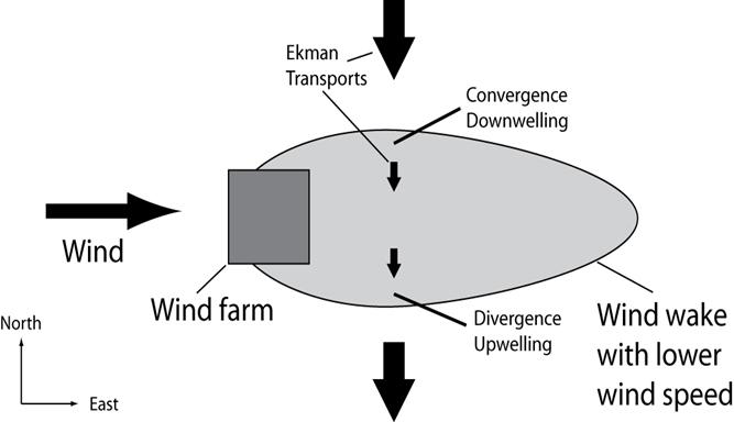 Vinden har den egenskapen på havoverflaten at den setter opp en sirkulasjon til høyre (nordlige halvkule) for vindretningen, og innen overflatelaget vil den totale vinddrevne transporten være rettet 90° mot høyre for vindretningen, den såkalte Ekman-transporten. Ettersom vindkraftanlegget reduserer vindhastigheten nedstrøms av anlegget, får man en konvergens- og en divergenssone i tilknytning til vindkraftanlegget (se Figur 4). Konvergens vil i praksis føre til nedstrømning, mens divergens vil medføre oppvelling av vannmasser, og det er styrken av disse vertikaltransportene som kan ha innflytelse på biomasseforflytninger lokalt rundt og nedstrøms av et vindkraftanlegg.