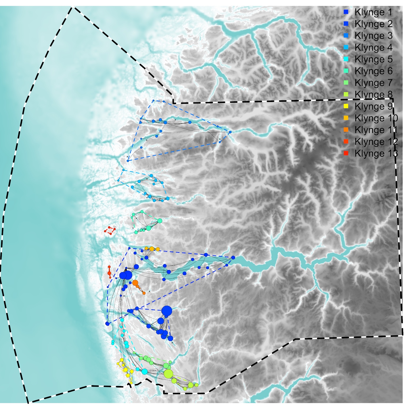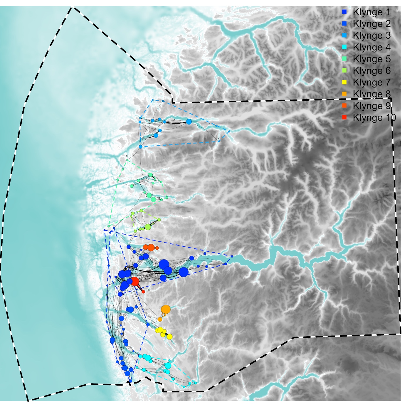 Basert på konnektivitetsmatrisen som oppsummerte lusesmitten mellom alle 122 lokaliteter som hadde rapportert lusetall i perioden 1/4-2017 til 30/9-2020 (av 134 som oppført i akvakulturregisteret under kommersiell lakseoppdrett av matfisk) trer det frem 10 klynger av sterkt sammenkoblede lokaliteter. Fra sør til nord omfavner klyngene lokaliteter fordelt over følgende fjorder og kyststrekninger (med referanse til klyngene i Figur 2): Osterfjorden, Sørfjorden, Herdlefjorden, og Radfjorden (K4); kyststrekningen fra Øygarden til Værlandet og halvveis inn i Austfjorden (K2); innerste del av Austfjord (K7); Masfjorden (K8); Gulafjorden (K10); Sognefjorden og Sognesjøen (K1); Ålfjorden (K9); Dalsfjorden og Stongfjorden (K6); Førdefjorden, Brufjorden, og Høydalsfjorden (K5); og Nordfjord og Frøysjøen (K3).