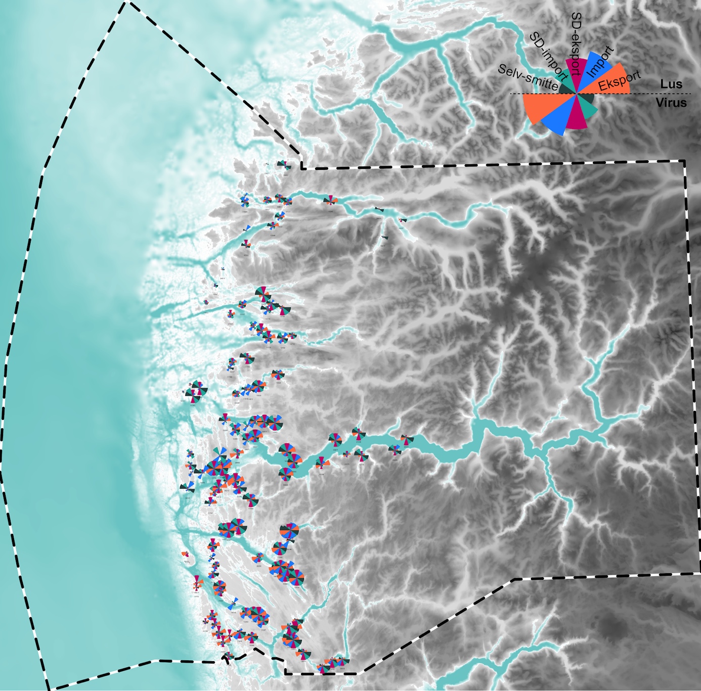 Spesifikt for klyngen Nordfjord-Frøysjøen observerte vi lav konnektivitet med lokaliteter i andre klynger, med unntak noen få lokaliteter i Frøysjøen. Koblingene innad i Nordfjord-Frøysjøen-klyngen var dominert av selv-smitte, og da særlig på virus-siden. Ethvert koordinert tiltak innad i Nordfjord vil derfor mest sannsynlig gi god effekt grunnet lav påvirkning utenfra.