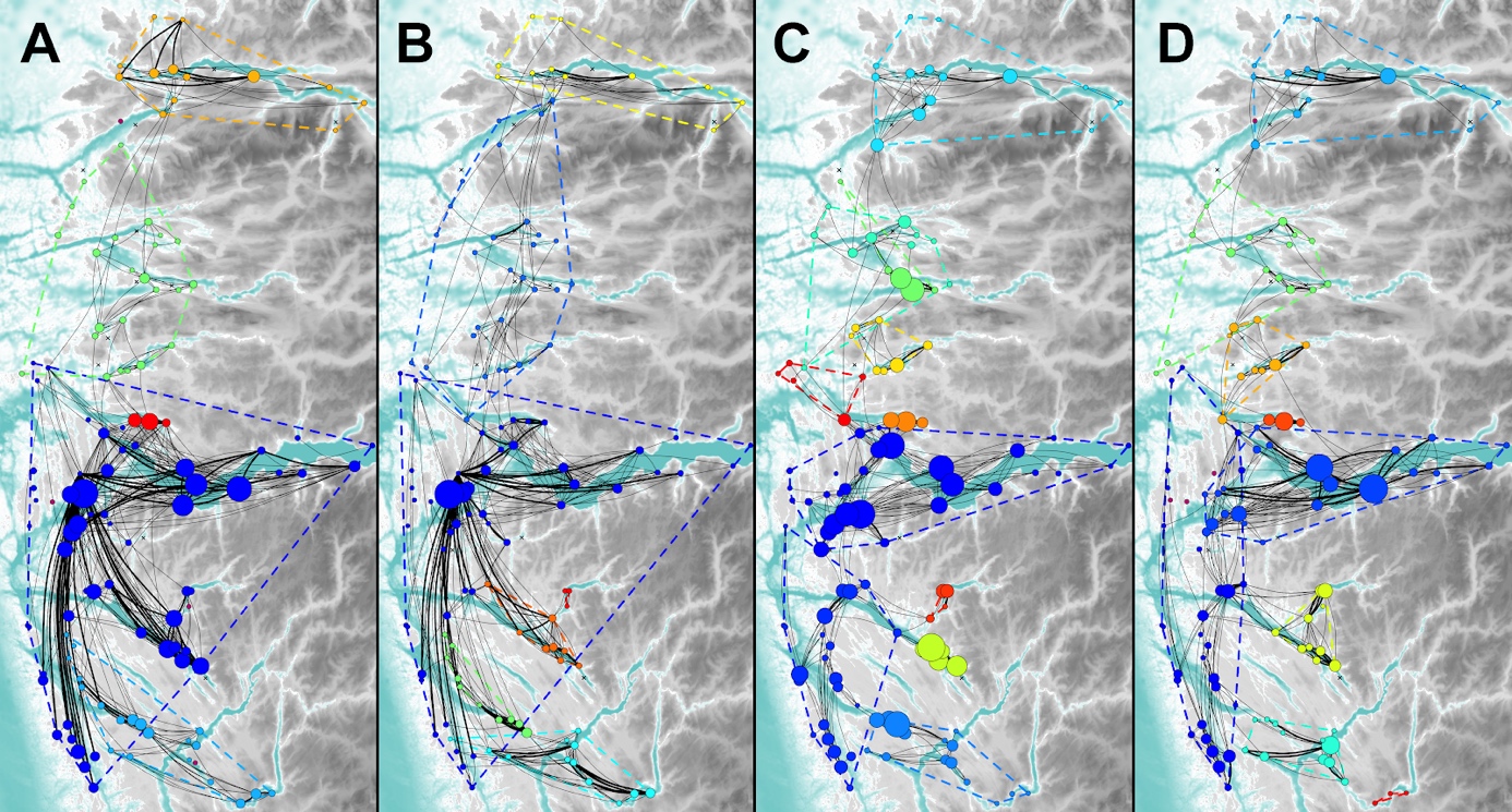 Figur 3 . Smittenettverk for lus delt opp i sesonger (antall klynger i parentes): A vinter (5 klynger); B vår (7 klynger); C sommer (11 klynger); og D høst (9 klynger). Lilla sirkler i panel A og D represente lokaliteter som ikke er koblet til nettverket, enten grunnet null koblinger til andre lokaliteter eller ingen drift i perioden. Ellers se forklaring Figur 2