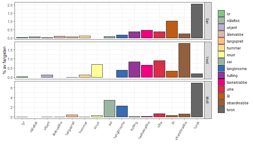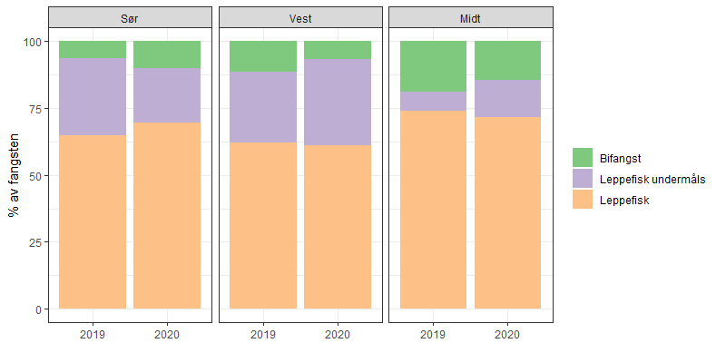 Omfanget av bifangst i fisket etter leppefisk har vært lite undersøkt. Bifangst skal etter regelverket slippes ut umiddelbart på fangststedet. Overholdes dette antas det lav påvirkning på andre arter, siden redskapen står på grunt vann og det er daglig røkteplikt. Det har likevel vært satt fokus på bifangst som en mulig utfordring i dette fisket, spesielt for kommersielt viktige arter som hummer, torsk og taskekrabbe. Havforskningsinstituttet har undersøkt artsfordelingen i fangstene som tas i leppefiskteiner med 9x6 cm ovale åpninger (2020 regelverk). Datagrunnlaget er totalt 1535 teinetrekk fra referansefiskere gjort i 2019 og 2020 (vedlegg 1). Leppefisk over minstemålet utgjør 60-75 % av fangsten (i antall i individer, Figur 4). Andelen bifangst, (utenom undermåls leppefisk), er høyest i region Midt (nord for 62 grader). Torsk er den mest vanlige bifangstarten i Region Sør (~2 % av totalfangsten; Figur 5) og Region Midt (~6.5 % av totalfangsten). Strandkrabbe er mest vanlig i Region Vest (1.8 % av totalfangsten). Bifangst av hummer er relativt lavt i dette fisket. Totalt ble det rapportert fanget 38 hummer, og kun 6 av disse var 25 cm eller større (minstemål for hummer).