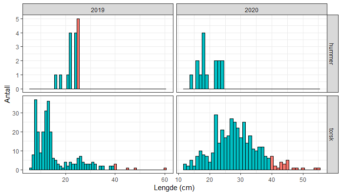 Figur 6 : Lengdefordeling av bifangstartene hummer og torsk i referansefiske. Rød farge: over minstemål.