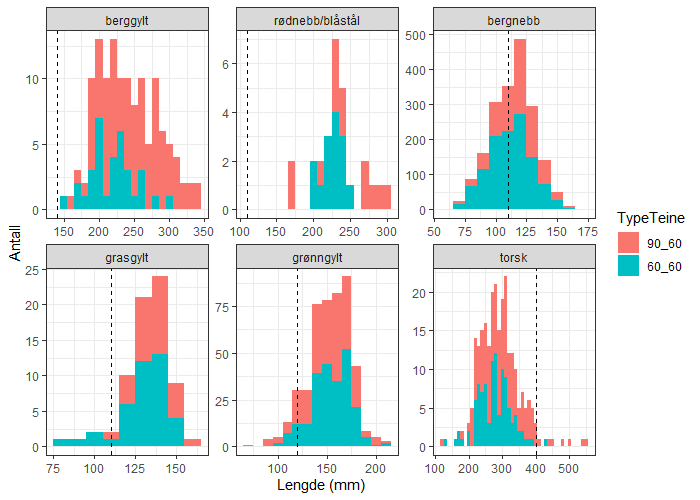 Figur 2 : Lengdefordeling i forsøksfisket, farge indikerer andel tatt med foreslått inngangsutforming (sirkulære, 6 cm diameter, turkis farge) vs. teiner med ovale innganger høyde 9 cm, bredde 6 cm (rød farge).