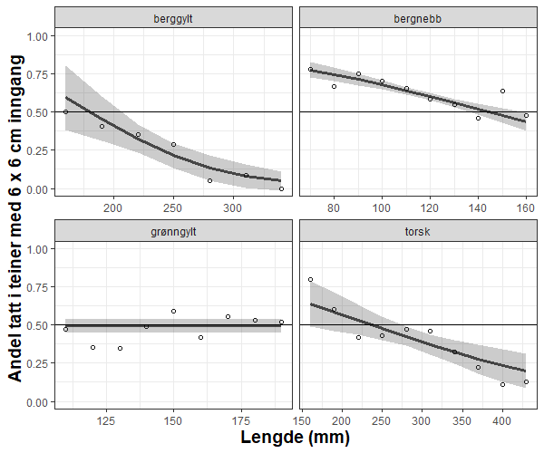 Figur 1 . Estimert (linje, 95 % konfidensintervall) og observert (åpne sirkler) andel fisk fanget i teiner med foreslått inngangsutforming (sirkulære, 6 cm diameter) vs. teiner med ovale innganger høyde 9 cm, bredde 6 cm. Horisontal linje markerer lik fangsteffektivitet i de to redskapene. Data er analysert ved bruk av generaliserte lineære modeller i R.
