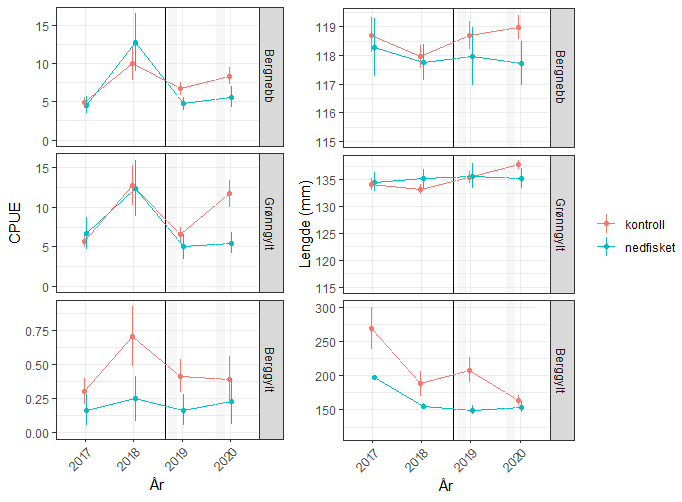 Videre arbeid: HI vil i 2020 og 2021 undersøke fiskeripåvirkning på vekst og overlevelse i disse områdene, siden lavere tetthet i teorien kan forventes å ha en positiv effekt på vekst og overlevelse hvis fødetilgang og habitat er begrensende faktorer. I 2021 vil det arbeides med å bruke merke-gjenfangst modeller for å estimere naturlig og fiskeridødelighet, samt selektivitet, fangbarhet. Dette er sentrale parametere i bestandsmodeller, og det er nylig blitt publisert en slik modell for grønngylt (Kindsvater et al. 2020) som også kan tilpasses de andre artene.