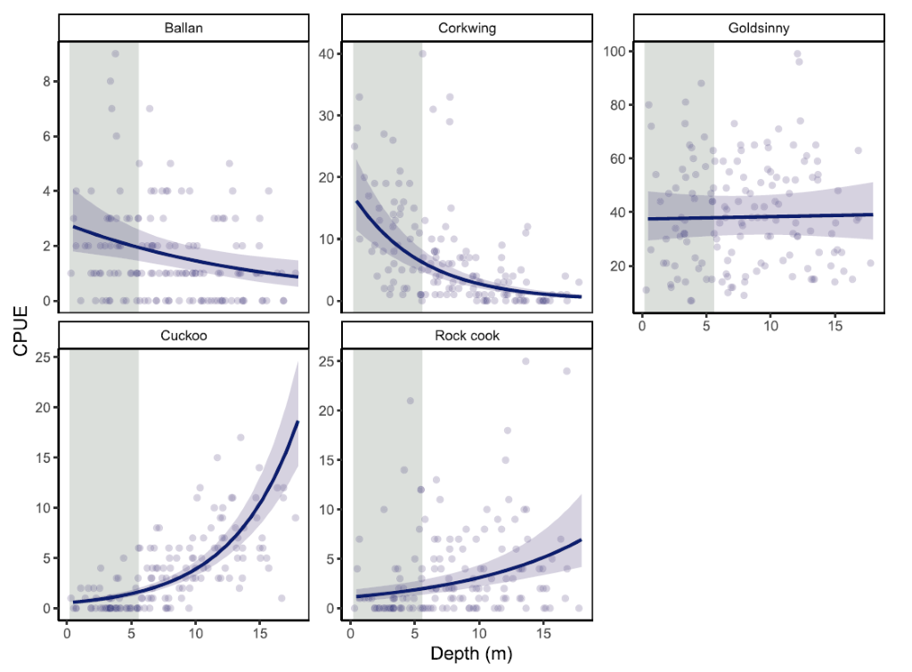 Figur 7 : Dybdefordeling av leppefisk vist ved CPUE (fangst per teine) av de forskjellige leppefiskartene fordelt på dybde (m). Linjen viser modellprediksjon og 95 % konfidensintervall. Leppefiskartene er berggylt – ballan, grønngylt - corkwing, bergnebb – goldsinny, rødnebb/blåstål - cuckoo og grasgylt – rock cook). Figur fra Halvorsen et al. . 2020.