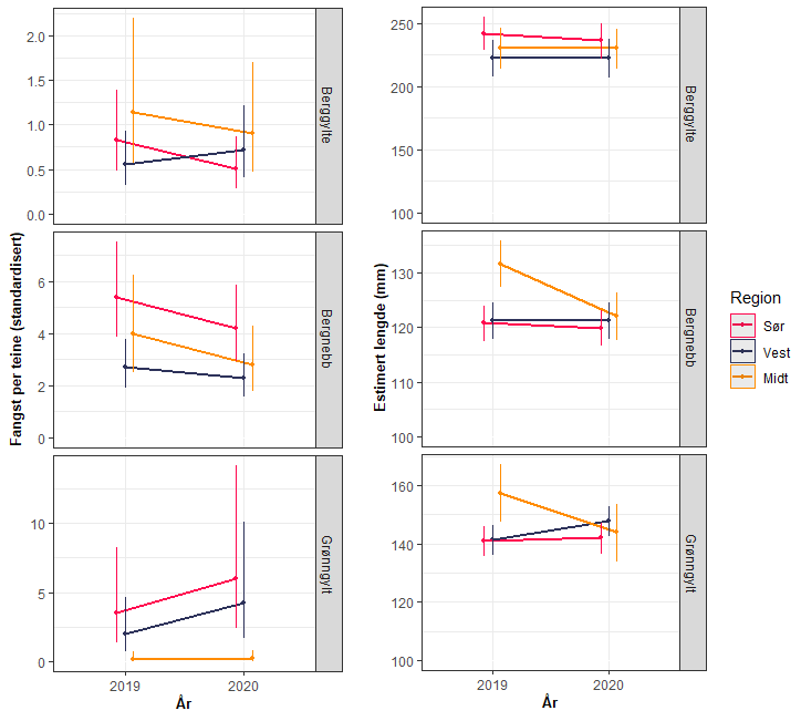 HI reviderte referansefiskerordningen før 2019 sesongen og har etablert en ny metode for datainnsamling. Denne endringen ble begrunnet og redegjort for i fjorårets kunnskapsstøtte (Skiftesvik og Halvorsen 2019). For å vurdere bestandssituasjonen for 2020 har vi derfor kun 2019 som sammenlikningsgrunnlag siden det ikke er mulig å standardisere fangstdata fra årene før dette (Halvorsen et al. 2020). Man bør derfor ha en konservativ tilnærming til å konkludere med endringer før en lengre tidsserie er tilgjengelig. HI vil basere anbefaling om uttak i påfølgende år på størrelsen (og usikkerheten) i observerte endringene i estimert CPUE (Catch-per-unit-effort; standardisert fangst av leppefisk over minstemål per teine) samt endringer i gjennomsnittsstørrelse. Modellene som ligger til grunn inkluderer miljøvariabler som kan påvirke fangbarhet og tar høyde for lokale forskjeller ved å inkludere “Fisker” i som en såkalt random effect (se vedlegg 1 og 2 for oversikt over geografisk fordeling av fiskere samt modell estimater). Figur 3 viser modellprediksjonene for CPUE og lengde i de tre områdene. Det er ingen signifikante endringer i CPUE mellom år, innad områder (overlappende 95 % konfidensintervall). Modellprediksjonene sammenfaller med i stor grad med rapporter fra fiskere og artsfordelingen i Fiskeridirektoratets fangststatistikk for 2020. HI vurderer det derfor som sannsynlig at bestandssituasjonen for leppefisk ikke er betydelig endret fra 2019 i de tre fangstområdene. Det er ingen endring i lengde for Region Sør og Vest for noen av artene. I Midt-Norge er det en nedgang i gjennomsnittsstørrelsen for bergnebb og grønngylt, men ligger for 2020 på samme nivå som region Sør og Vest. Det vil derfor være viktig å følge med om den negative utviklingen fortsetter i Midt-Norge i 2021 eller om den stabiliseres eller øker igjen. For å sikre et robust vitenskapelig grunnlag for justering av uttak basert på data fra referansefiskere i kommende år, er det viktig å redusere usikkerheten i modellestimatene. En årsak til at den har vært høyere enn forventet er at det har vært utfordrende å få kontinuitet i referansefiskergruppen i omleggingsfasen av metodikken (vedlegg 1). HI vil vurdere konkrete tiltak for å redusere usikkerheten, blant annet ved å forbedre kompensasjonsordningen samt å utvide med flere referansefiskere.