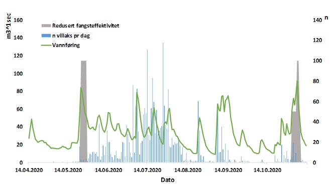 I 2020 vart fella sett i drift 14. april og registreringa pågjekk til 13. november. Også i 2020 var det nokre timar og dagar med redusert fangsteffektivitet grunna høg vassføring (Fig. 2), til saman 7,5 driftsdøgn og 5 netter eller ca 5 % av driftsperioden april-november, mot 5 driftsdøgn og 5 netter (ca 5 %) i 2019, 13 dagar (5 %) i 2018 og 11 dagar (6 %) i 2017. I slike periodar med store flaumtoppar og vanskar med reinhald, vil det høgst truleg passera ein del fisk. I 2020 var det to periodar med redusert fangsteffektivitet (markert i grått i figuren).