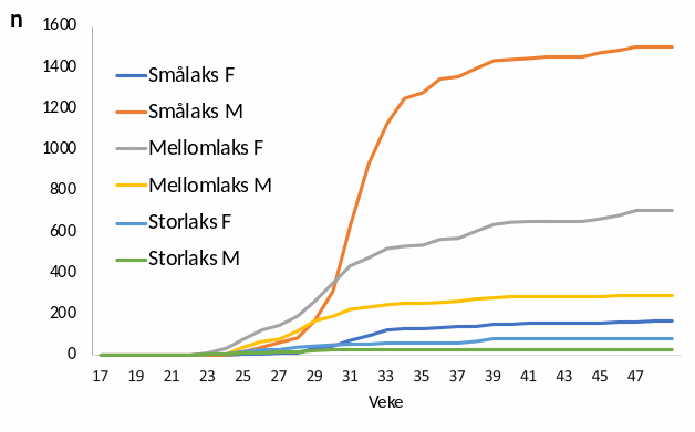 Oppvandringa delt i storleiksklassar, viste som før at fleirsjøvinterlaksen kjem først på plass i elva, og den minste terten sist i perioden. (Fig. 4).