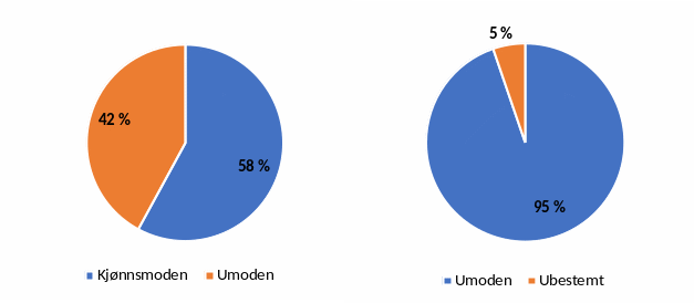 Figur 6. Kjønnsmodning hos oppdrettslaksen registrert på fella i 2020 (venstre) og i utfiskinga nedstraums fella (høgre). Sexual maturation in escaped farmed salmon captured on the trap (left) and in the selective autumn angling (right).